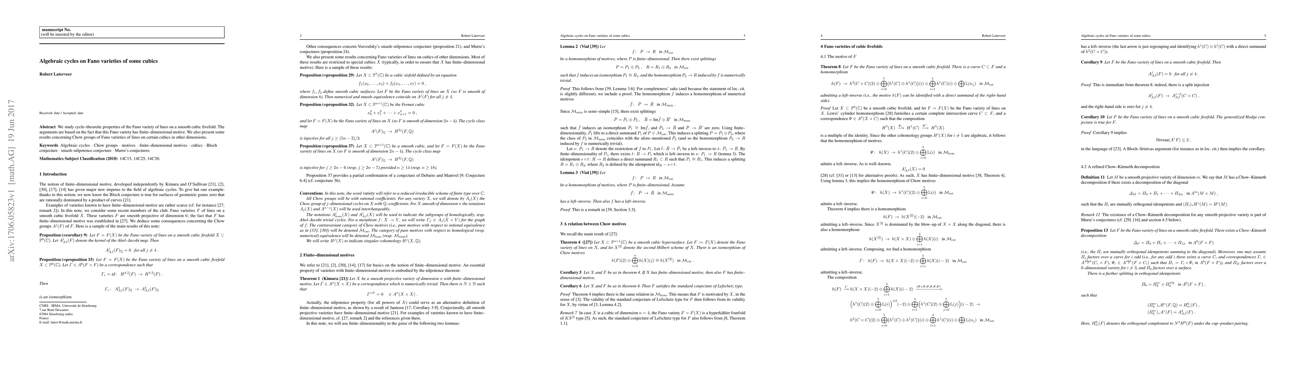 This paper investigates the algebraic cycles on Fano varieties of lines on smooth cubic fivefolds, utilizing the finite-dimensional motive of these varieties. It also explores the Chow groups of Fano varieties of lines on cubics in various dimensions.