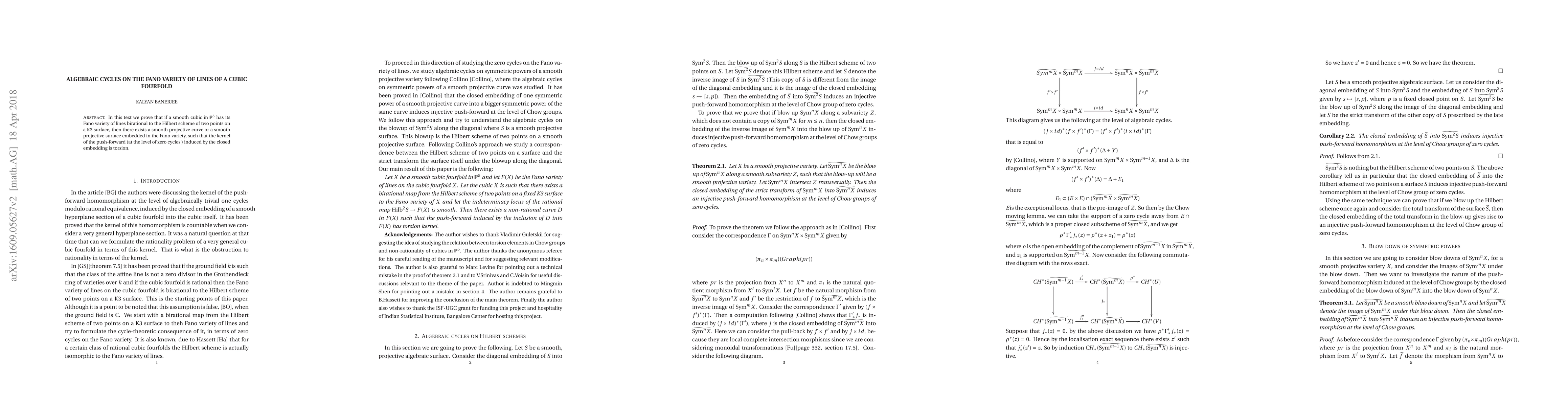 The paper proves that for a smooth cubic fourfold in $\PR^5$ with its Fano variety of lines birational to the Hilbert scheme of two points on a K3 surface, there exists an embedded smooth projective curve or surface in the Fano variety with a torsion kernel in the push-forward of zero cycles.