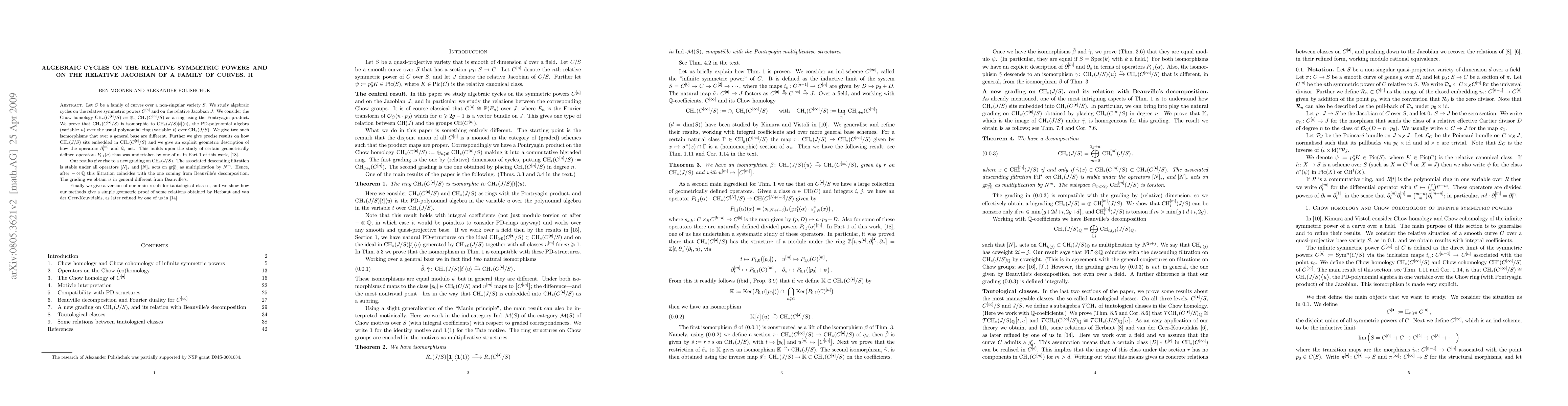 This paper explores algebraic cycles on symmetric powers and Jacobians of a curve over a non-singular base. It establishes isomorphisms between Chow homology rings of symmetric power sums and Jacobians, proposing a new grading on the Chow ring of the Jacobian distinct from Beauville's. The research also offers a simple proof for certain relations, using geometric methods.
