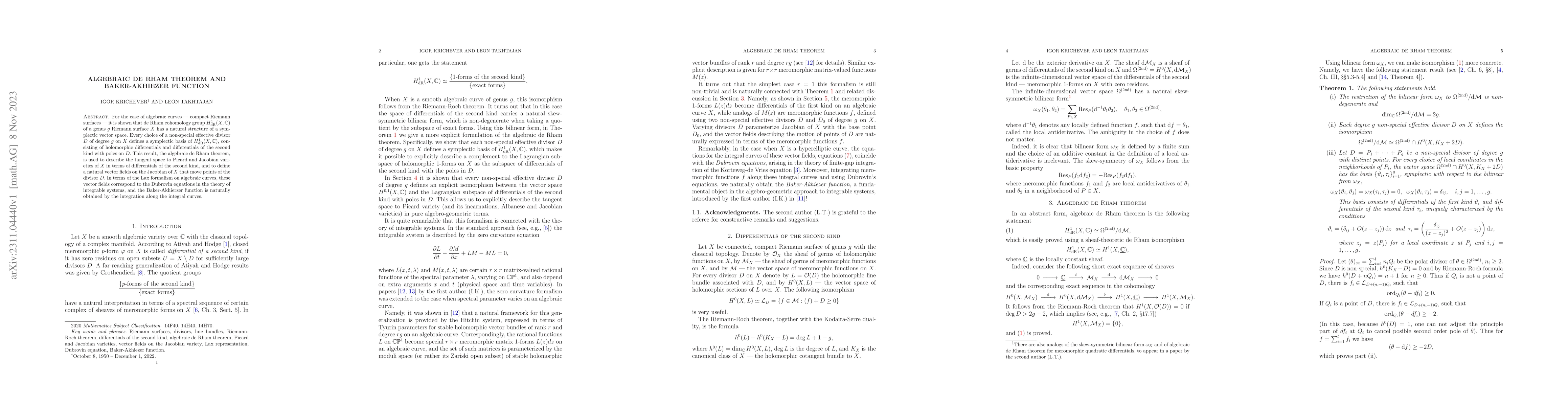 The algebraic de Rham theorem establishes a symplectic structure on the first de Rham cohomology group of a genus $g$ Riemann surface, using holomorphic differentials and differentials of the second kind. The Baker-Akhiezer function emerges naturally from integrating along the integral curves corresponding to Dubrovin equations in the Lax formalism.