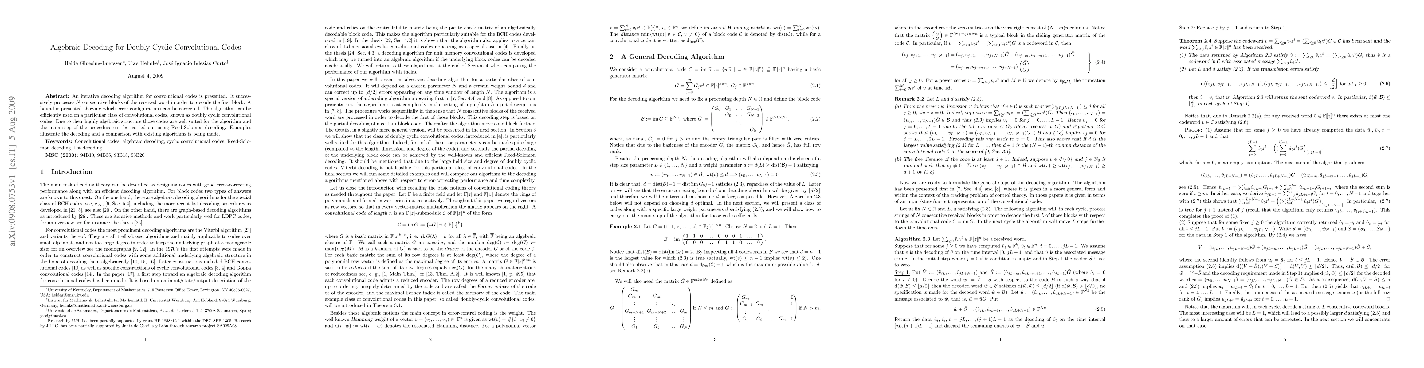This paper introduces an iterative decoding algorithm for doubly cyclic convolutional codes, utilizing Reed-Solomon decoding for efficiency. The algorithm processes consecutive blocks to decode the first, with a bound on correctable error configurations, and is compared against existing methods.