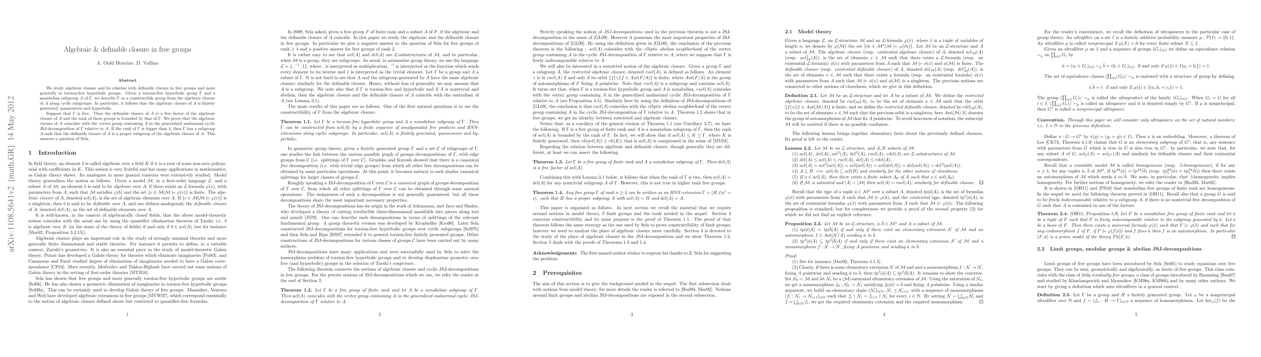We study algebraic closure and its relation with definable closure in free groups and more generally in torsion-free hyperbolic groups. Given a torsion-free hyperbolic group G and a nonabelian subgroup A of G, we describe G as a constructible group from the algebraic closure of A along cyclic subgroups. In particular, it follows that the algebraic closure of A is finitely generated, quasiconvex and hyperbolic. Suppose that G is free. Then the definable closure of A is a free factor of the algebraic closure of A and the rank of these groups is bounded by that of G. We prove that the algebraic closure of A coincides with the vertex group containing A in the generalized cyclic JSJ-decomposition of G relative to A. If the rank of G is bigger than 4, then G has a subgroup A such that the definable closure of A is a proper subgroup of the algebraic closure of A. This answers a question of Sela.