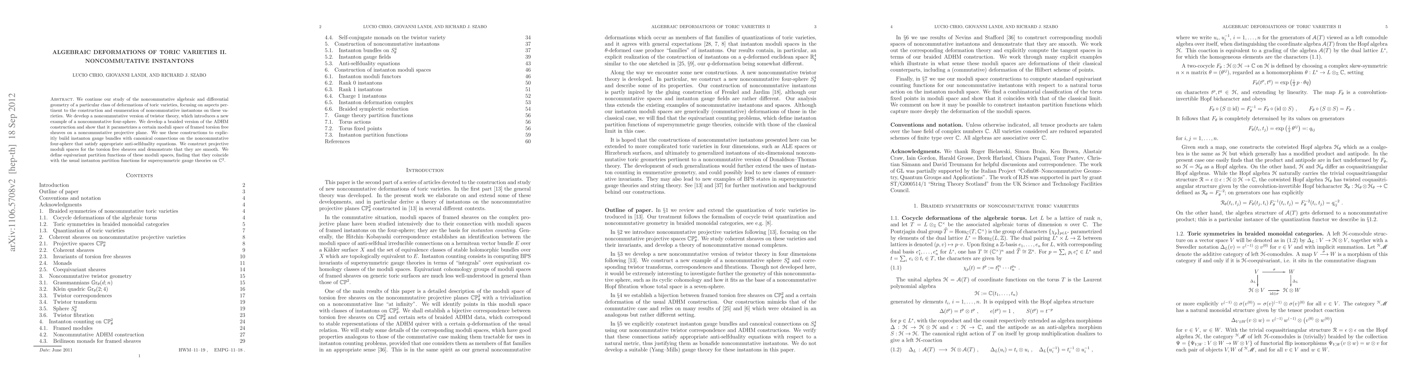 This paper explores noncommutative deformations of toric varieties, developing a noncommutative twistor theory and a braided ADHM construction. It constructs instanton gauge bundles on a noncommutative four-sphere and demonstrates the smoothness of associated projective moduli spaces, showing equivalence with instanton partition functions in supersymmetric gauge theories.
