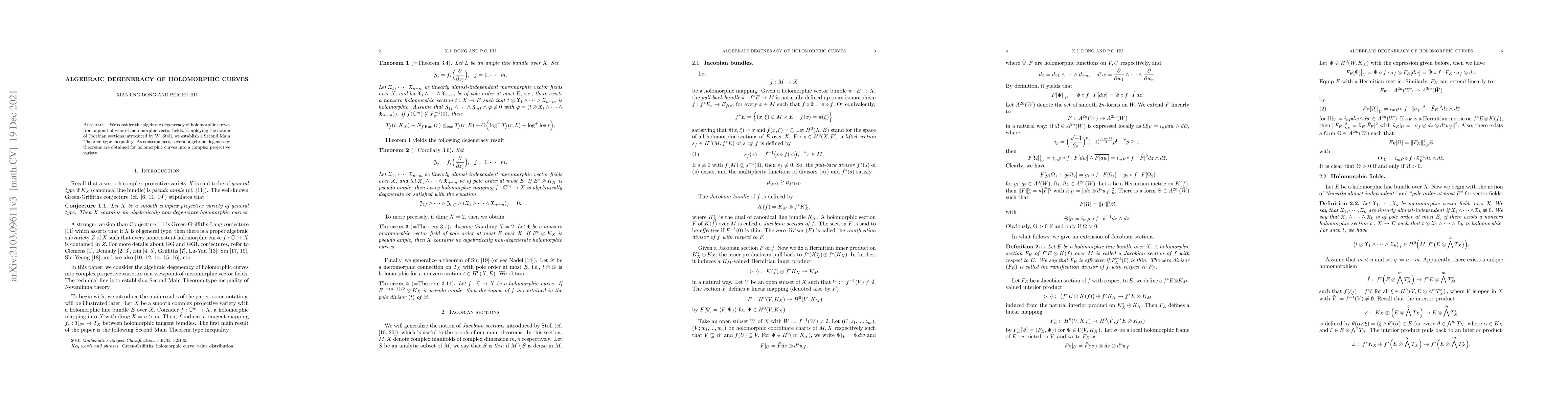 This paper explores the algebraic degeneracy of holomorphic curves through the lens of meromorphic vector fields and introduces a Second Main Theorem type inequality using Jocabian sections. The study results in several algebraic degeneracy theorems for holomorphic curves in complex projective varieties.