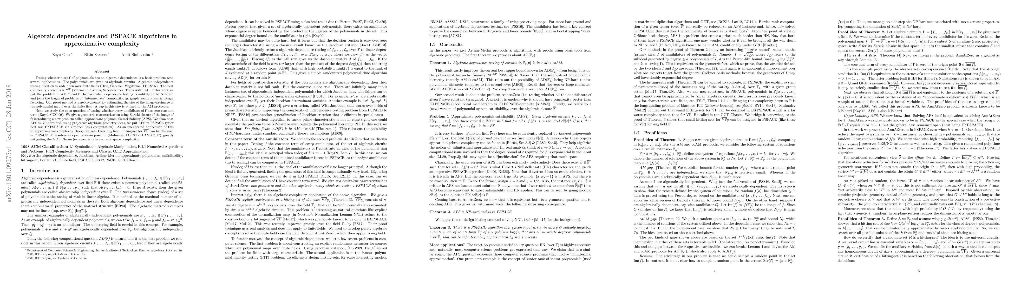 Testing whether a set $\mathbf{f}$ of polynomials has an algebraic dependence is a basic problem with several applications. The polynomials are given as algebraic circuits. Algebraic independence testing question is wide open over finite fields (Dvir, Gabizon, Wigderson, FOCS'07). The best complexity known is NP$^{\#\rm P}$ (Mittmann, Saxena, Scheiblechner, Trans.AMS'14). In this work we put the problem in AM $\cap$ coAM. In particular, dependence testing is unlikely to be NP-hard and joins the league of problems of "intermediate" complexity, eg. graph isomorphism & integer factoring. Our proof method is algebro-geometric-- estimating the size of the image/preimage of the polynomial map $\mathbf{f}$ over the finite field. A gap in this size is utilized in the AM protocols. Next, we study the open question of testing whether every annihilator of $\mathbf{f}$ has zero constant term (Kayal, CCC'09). We give a geometric characterization using Zariski closure of the image of $\mathbf{f}$; introducing a new problem called approximate polynomials satisfiability (APS). We show that APS is NP-hard and, using projective algebraic-geometry ideas, we put APS in PSPACE (prior best was EXPSPACE via Grobner basis computation). As an unexpected application of this to approximative complexity theory we get-- Over any field, hitting-set for $\overline{\rm VP}$ can be designed in PSPACE. This solves an open problem posed in (Mulmuley, FOCS'12, J.AMS 2017); greatly mitigating the GCT Chasm (exponentially in terms of space complexity).