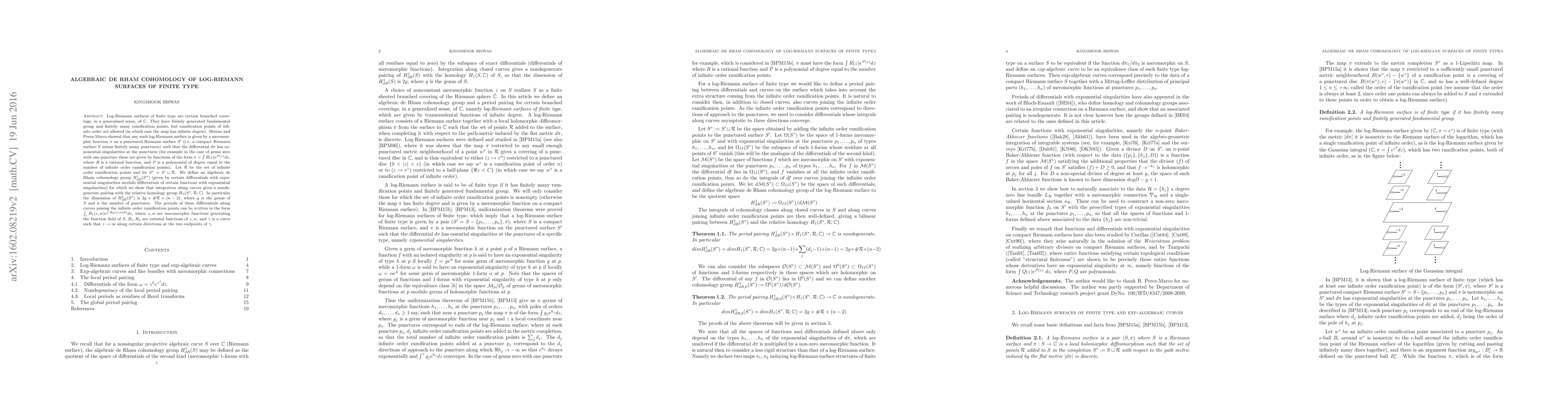 This paper defines and proves the nondegeneracy of a period pairing for log-Riemann surfaces of finite type, showing that the dimension of the associated cohomology group is finite and determined by the genus, ramification points, and exponential singularities. The result is expressed as (2g + #R + (n-2)).