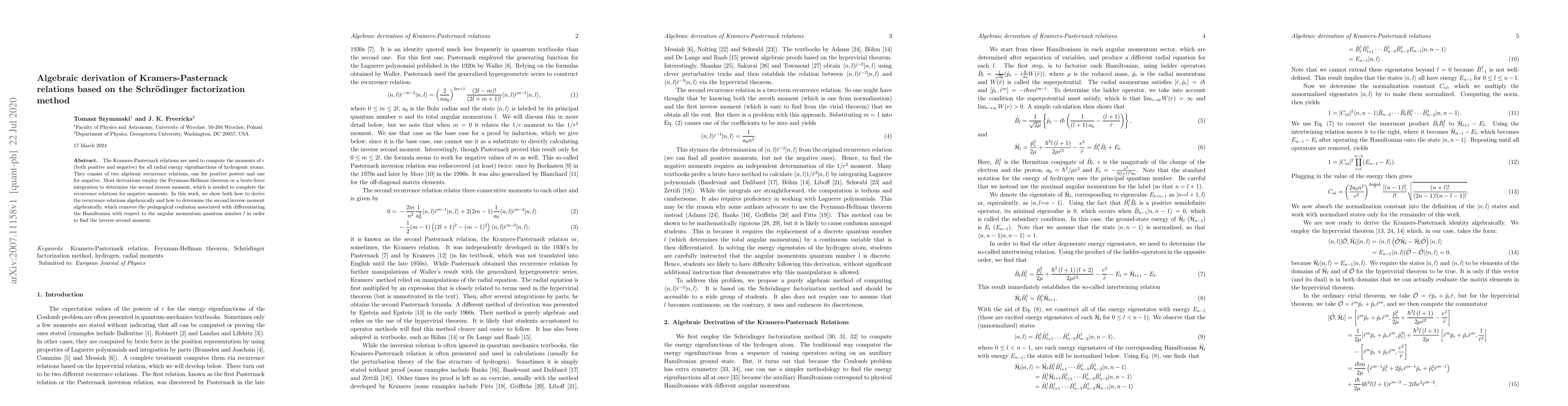 The Kramers-Pasternack relations are used to compute the moments of r (both positive and negative) for all radial energy eigenfunctions of hydrogenic atoms. They consist of two algebraic recurrence relations, one for positive powers and one for negative. Most derivations employ the Feynman-Hellman theorem or a brute-force integration to determine the second inverse moment, which is needed to complete the recurrence relations for negative moments. In this work, we show both how to derive the recurrence relations algebraically and how to determine the second inverse moment algebraically, which removes the pedagogical confusion associated with differentiating the Hamiltonian with respect to the angular momentum quantum number l in order to find the inverse second moment.