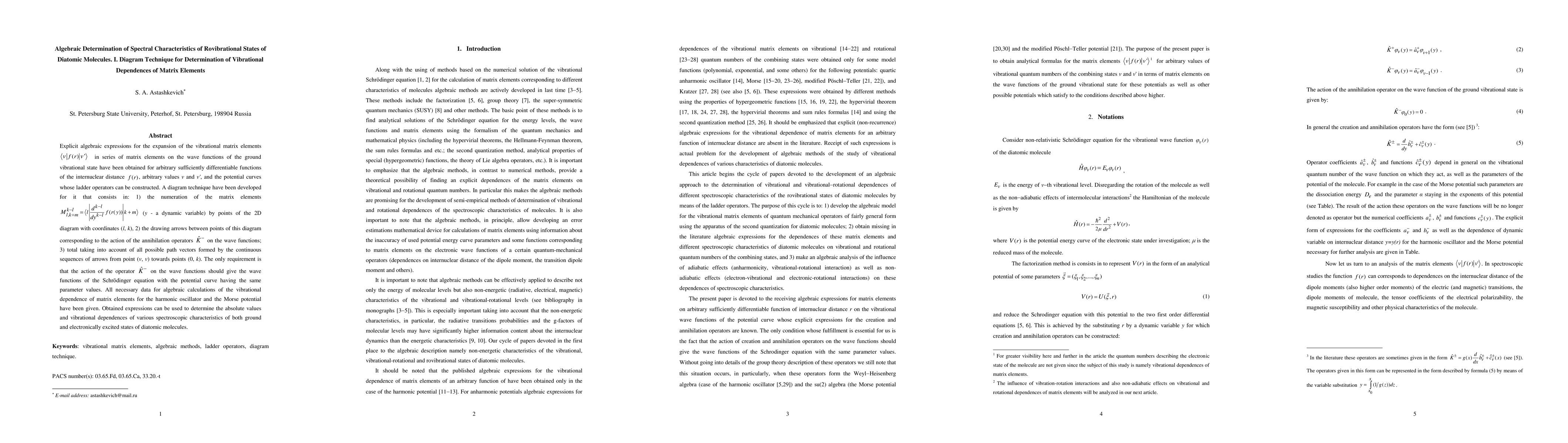 Explicit algebraic expressions for the expansion of the vibrational matrix elements in series of matrix elements on the wave functions of the ground vibrational state have been obtained for arbitrary sufficiently differentiable functions of the internuclear distance, arbitrary values v and v', and the potential curves whose ladder operators can be constructed. A diagram technique have been developed for it that consists in: 1) the numeration of the matrix elements by points of the 2D diagram with coordinates (l, k), 2) the drawing arrows between points of this diagram corresponding to the action of the annihilation operators on the wave functions; 3) total taking into account of all possible path vectors formed by the continuous sequences of arrows from point (v, v) towards points (0, k). The only requirement is that the action of the operator on the wave functions should give the wave functions of the Schr\"odinger equation with the potential curve having the same parameter values. All necessary data for algebraic calculations of the vibrational dependence of matrix elements for the harmonic oscillator and the Morse potential have been given. Obtained expressions can be used to determine the absolute values and vibrational dependences of various spectroscopic characteristics of both ground and electronically excited states of diatomic molecules.