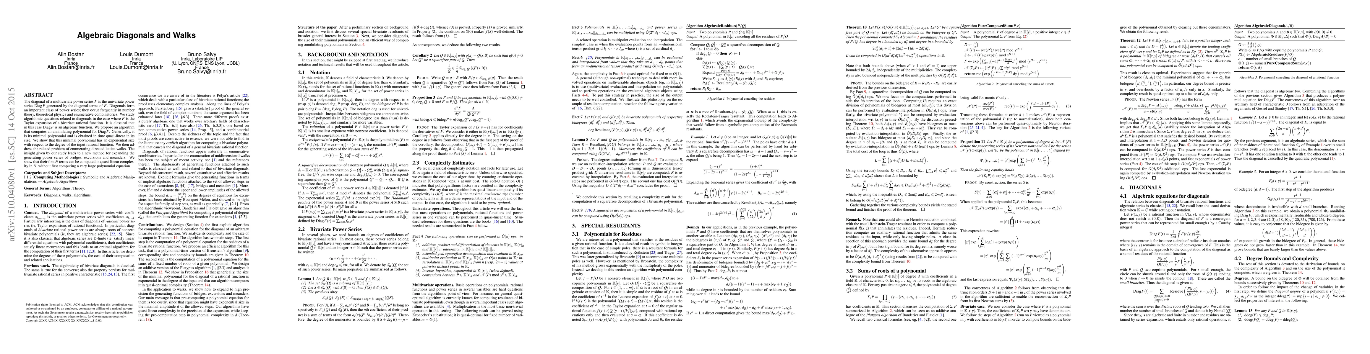 The diagonal of a multivariate power series F is the univariate power series Diag(F) generated by the diagonal terms of F. Diagonals form an important class of power series; they occur frequently in number theory, theoretical physics and enumerative combinatorics. We study algorithmic questions related to diagonals in the case where F is the Taylor expansion of a bivariate rational function. It is classical that in this case Diag(F) is an algebraic function. We propose an algorithm that computes an annihilating polynomial for Diag(F). Generically, it is its minimal polynomial and is obtained in time quasi-linear in its size. We show that this minimal polynomial has an exponential size with respect to the degree of the input rational function. We then address the related problem of enumerating directed lattice walks. The insight given by our study leads to a new method for expanding the generating power series of bridges, excursions and meanders. We show that their first N terms can be computed in quasi-linear complexity in N, without first computing a very large polynomial equation.