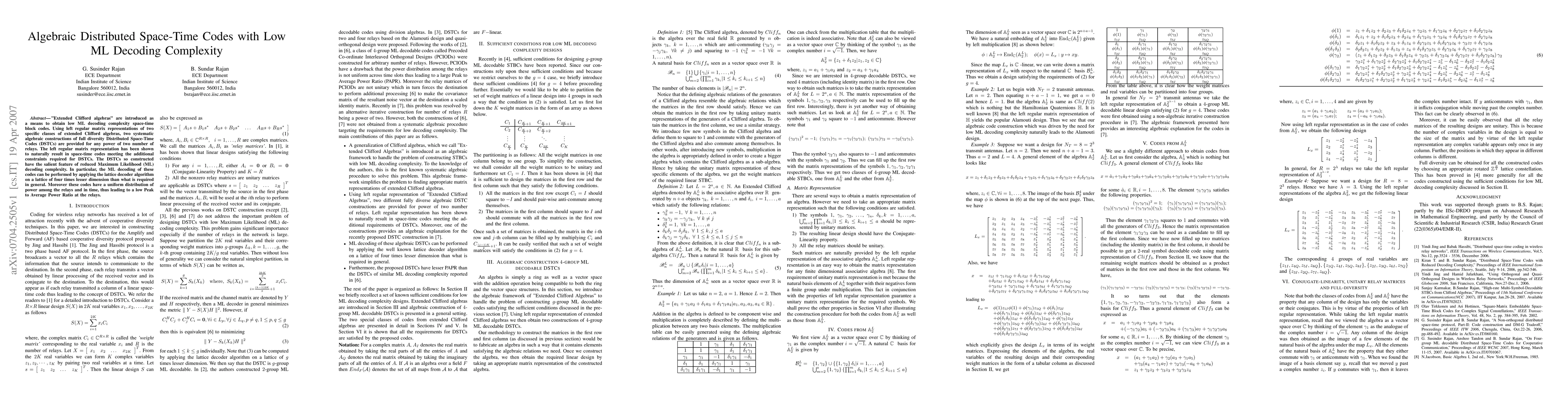 This paper proposes algebraic constructions of Distributed Space-Time Codes (DSTCs) using "extended Clifford algebras" to achieve low Maximum Likelihood (ML) decoding complexity. The left regular matrix representation of these algebras leads to codes with full diversity and significantly reduced ML decoding complexity, achieved through a lattice decoder algorithm requiring four times less dimension than usual.