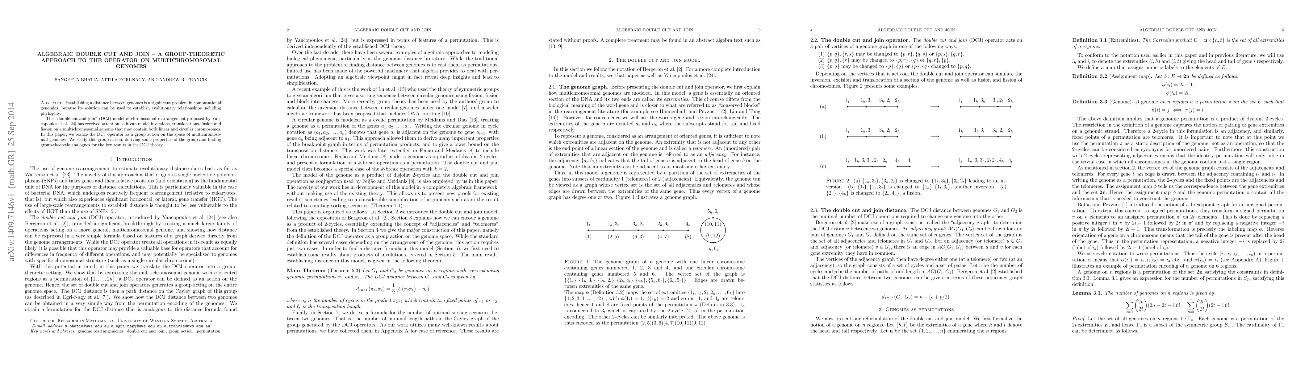 This paper explores the "double cut and join" (DCJ) model for chromosomal rearrangements as a group action on multichromosomal genomes, deriving group-theoretic properties and analogues for key results in DCJ theory to better understand evolutionary relationships and phylogeny.