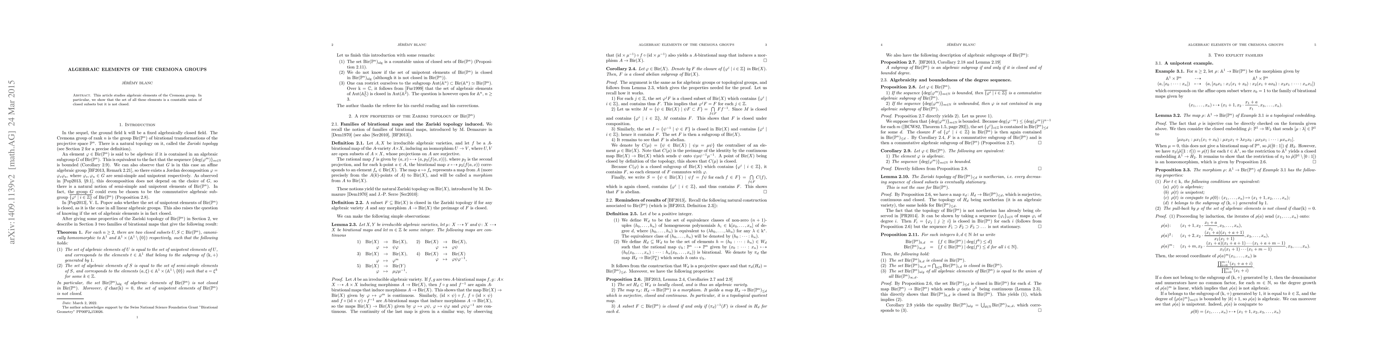 The paper studies algebraic elements of the Cremona group using the Zariski topology, demonstrating that the set of all algebraic elements is a countable union of closed subsets but not closed itself.