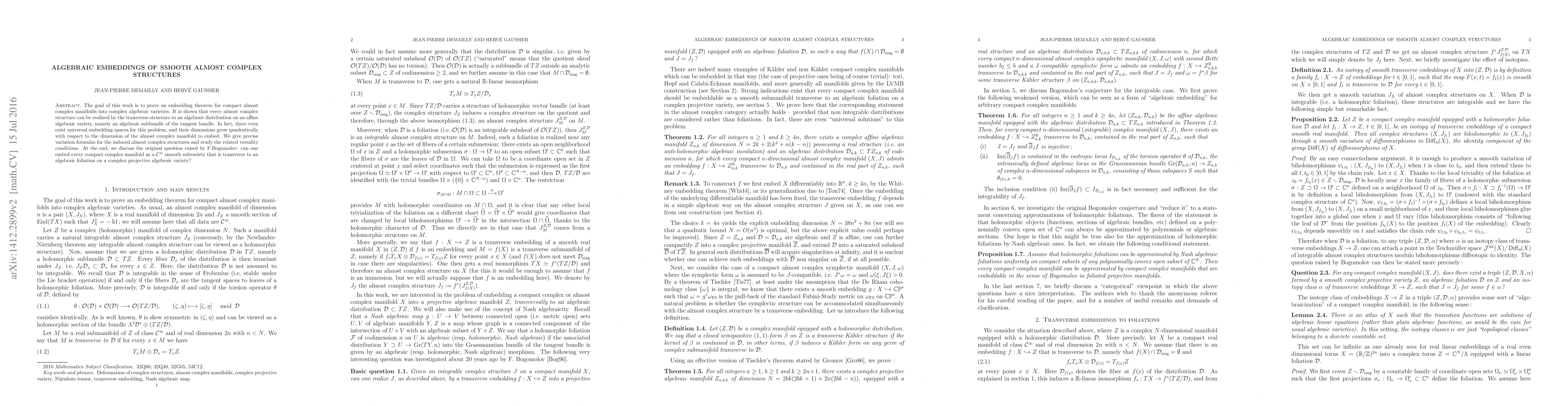 The goal of this work is to prove an embedding theorem for compact almost complex manifolds into complex algebraic varieties. It is shown that every almost complex structure can be realized by the transverse structure to an algebraic distribution on an affine algebraic variety, namely an algebraic subbundle of the tangent bundle. In fact, there even exist universal embedding spaces for this problem, and their dimensions grow quadratically with respect to the dimension of the almost complex manifold to embed. We give precise variation formulas for the induced almost complex structures and study the related versality conditions. At the end, we discuss the original question raised by F.Bogomolov: can one embed every compact holomorphic manifold as a C infinity smooth subvariety that is transverse to an algebraic foliation on a complex projective algebraic variety?