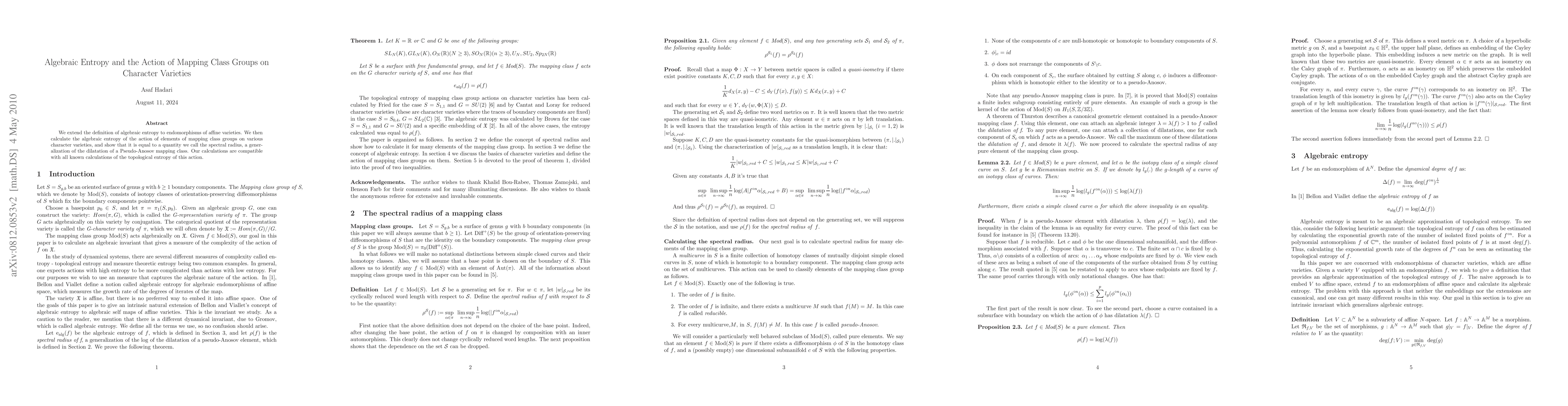 Summary: This paper defines algebraic entropy for endomorphisms of affine varieties and calculates it for mapping class groups' actions on character varieties, finding it equivalent to a spectral radius, which generalizes the dilatation of Pseudo-Anosov mapping classes. The results align with existing topological entropy calculations.