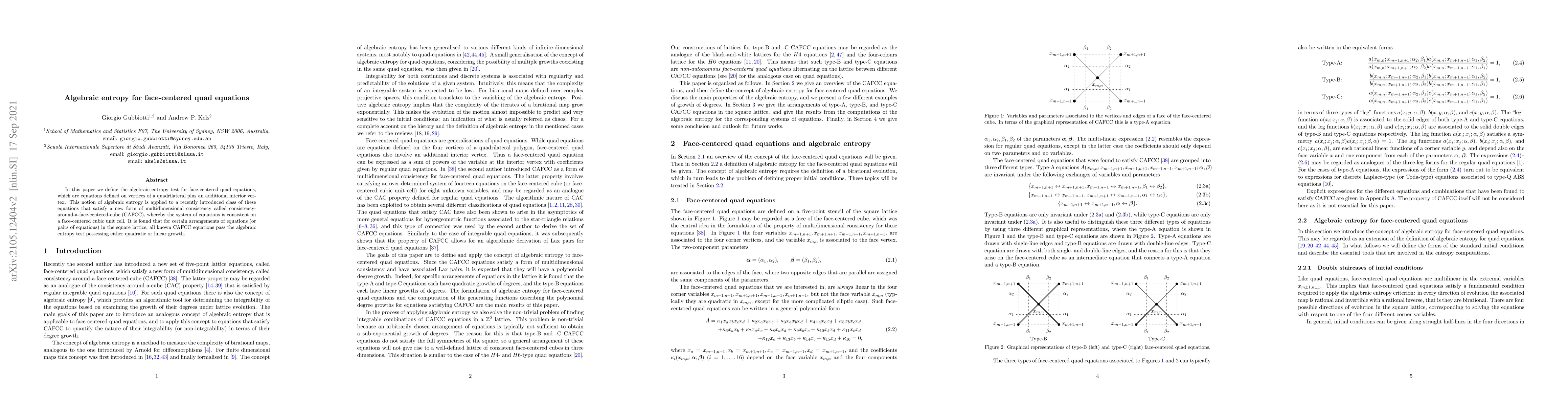 In this paper we define the algebraic entropy test for face-centered quad equations, which are equations defined on vertices of a quadrilateral plus an additional interior vertex. This notion of algebraic entropy is applied to a recently introduced class of these equations that satisfy a new form of multidimensional consistency called consistency-around-a-face-centered-cube (CAFCC), whereby the system of equations is consistent on a face-centered cubic unit cell. It is found that for certain arrangements of equations (or pairs of equations) in the square lattice, all known CAFCC equations pass the algebraic entropy test possessing either quadratic or linear growth.