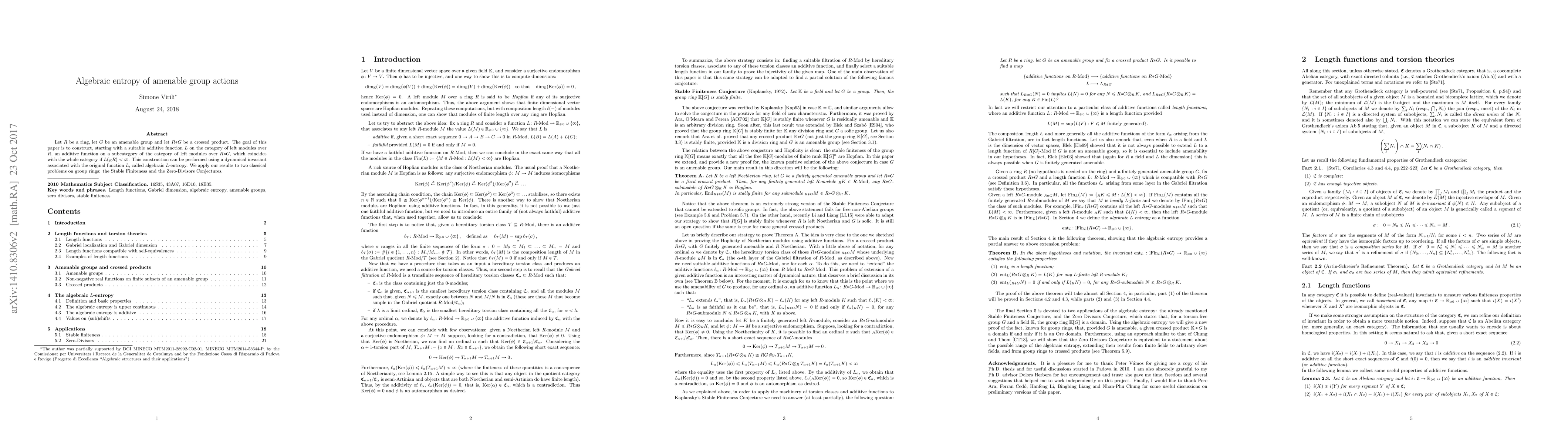 Let $R$ be a ring, let $G$ be an amenable group and let $R\ast G$ be a crossed product. The goal of this paper is to construct, starting with a suitable additive function $L$ on the category of left modules over $R$, an additive function on a subcategory of the category of left modules over $R\ast G$, which coincides with the whole category if $L({}_RR) <\infty$. This construction can be performed using a dynamical invariant associated with the original function $L$, called algebraic $L$-entropy. We apply our results to two classical problems on group rings: the Stable Finiteness and the Zero-Divisors Conjectures.