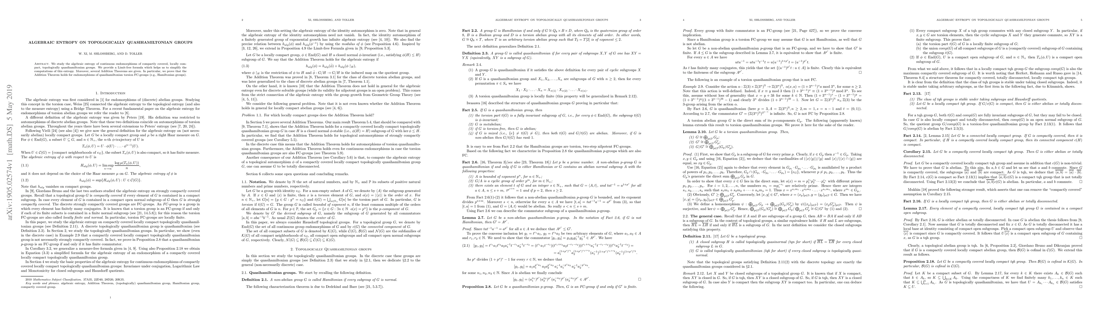 We study the algebraic entropy of continuous endomorphisms of compactly covered, locally compact, topologically quasihamiltonian groups. We provide a Limit-free formula which helps us to simplify the computations of this entropy. Moreover, several Addition Theorems are given. In particular, we prove that the Addition Theorem holds for endomorphisms of quasihamiltonian torsion FC-groups (e.g., Hamiltonian groups).