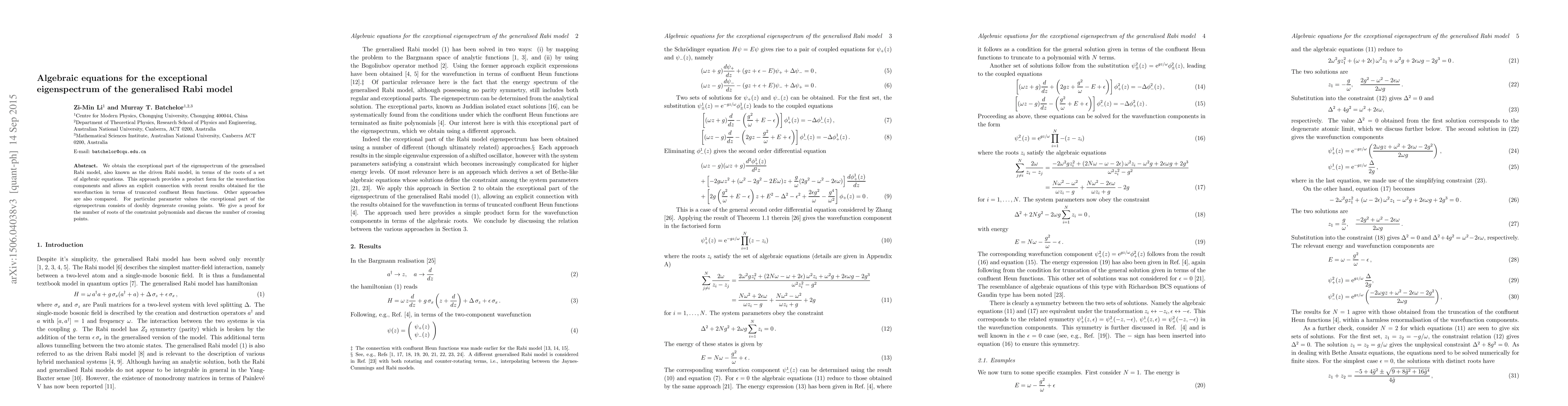 We obtain the exceptional part of the eigenspectrum of the generalised Rabi model, also known as the driven Rabi model, in terms of the roots of a set of algebraic equations. This approach provides a product form for the wavefunction components and allows an explicit connection with recent results obtained for the wavefunction in terms of truncated confluent Heun functions. Other approaches are also compared. For particular parameter values the exceptional part of the eigenspectrum consists of doubly degenerate crossing points. We give a proof for the number of roots of the constraint polynomials and discuss the number of crossing points.