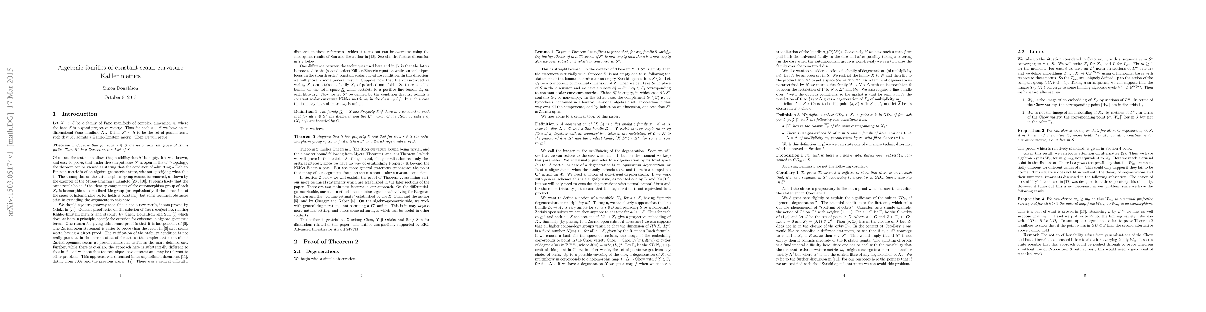 We give a new proof of the fact that the condition of a Fano manifold admitting a K\"ahler-Einstein metric is Zariski-open (provided that the automorphism group is discrete). This proof does not use the characterisation involving stability. The arguments involve estimates of Futaki invariants obtained from a differential-geometric "volume estimate", and variants of the algebro-geometric arguments of Stoppa. Many of the ideas apply to constant scalar curvature K\"ahler metrics.