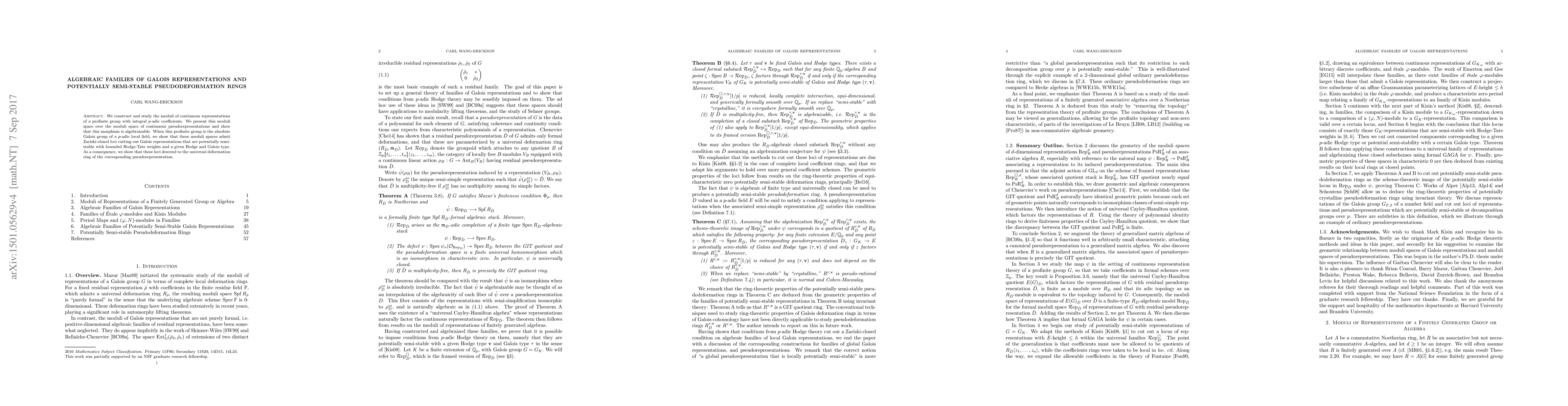 We construct and study the moduli of continuous representations of a profinite group with integral $p$-adic coefficients. We present this moduli space over the moduli space of continuous pseudorepresentations and show that this morphism is algebraizable. When this profinite group is the absolute Galois group of a $p$-adic local field, we show that these moduli spaces admit Zariski-closed loci cutting out Galois representations that are potentially semi-stable with bounded Hodge-Tate weights and a given Hodge and Galois type. As a consequence, we show that these loci descend to the universal deformation ring of the corresponding pseudorepresentation.