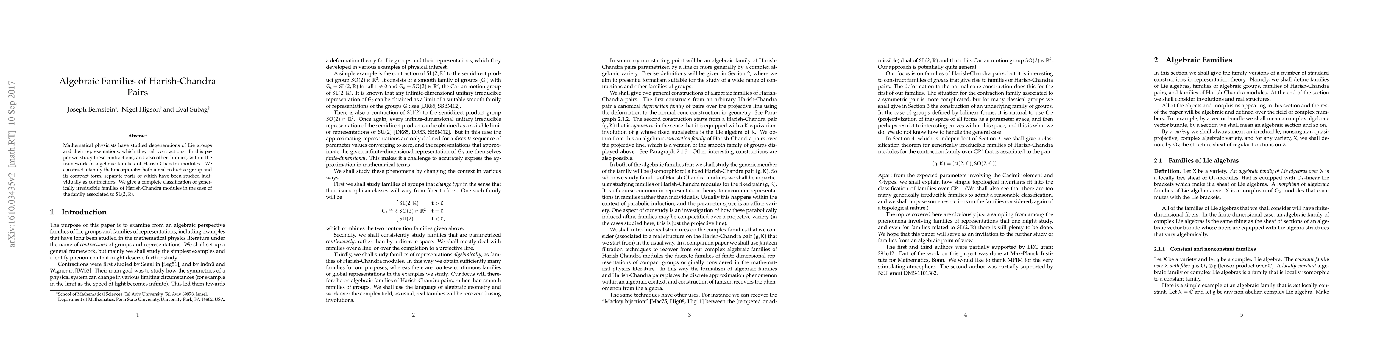 This paper explores algebraic families of Harish-Chandra pairs, focusing on the contractions of Lie groups and their representations. It constructs a comprehensive family that includes both real reductive and compact forms, providing a complete classification for the SL(2, R) case.