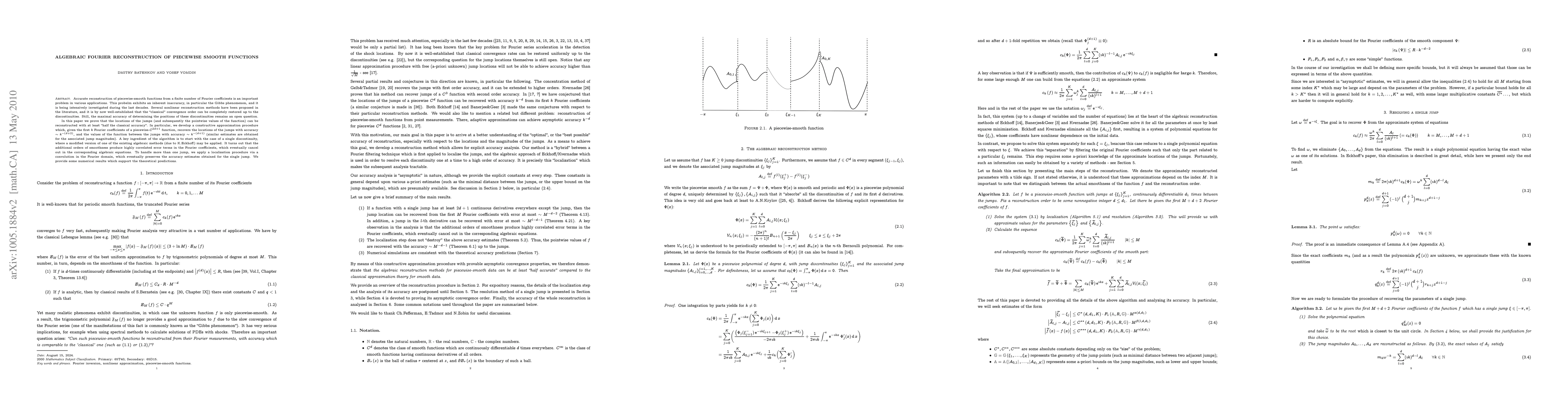 Accurate reconstruction of piecewise-smooth functions from a finite number of Fourier coefficients is an important problem in various applications. The inherent inaccuracy, in particular the Gibbs phenomenon, is being intensively investigated during the last decades. Several nonlinear reconstruction methods have been proposed, and it is by now well-established that the "classical" convergence order can be completely restored up to the discontinuities. Still, the maximal accuracy of determining the positions of these discontinuities remains an open question. In this paper we prove that the locations of the jumps (and subsequently the pointwise values of the function) can be reconstructed with at least "half the classical accuracy". In particular, we develop a constructive approximation procedure which, given the first $k$ Fourier coefficients of a piecewise-$C^{2d+1}$ function, recovers the locations of the jumps with accuracy $\sim k^{-(d+2)}$, and the values of the function between the jumps with accuracy $\sim k^{-(d+1)}$ (similar estimates are obtained for the associated jump magnitudes). A key ingredient of the algorithm is to start with the case of a single discontinuity, where a modified version of one of the existing algebraic methods (due to K.Eckhoff) may be applied. It turns out that the additional orders of smoothness produce a highly correlated error terms in the Fourier coefficients, which eventually cancel out in the corresponding algebraic equations. To handle more than one jump, we propose to apply a localization procedure via a convolution in the Fourier domain.