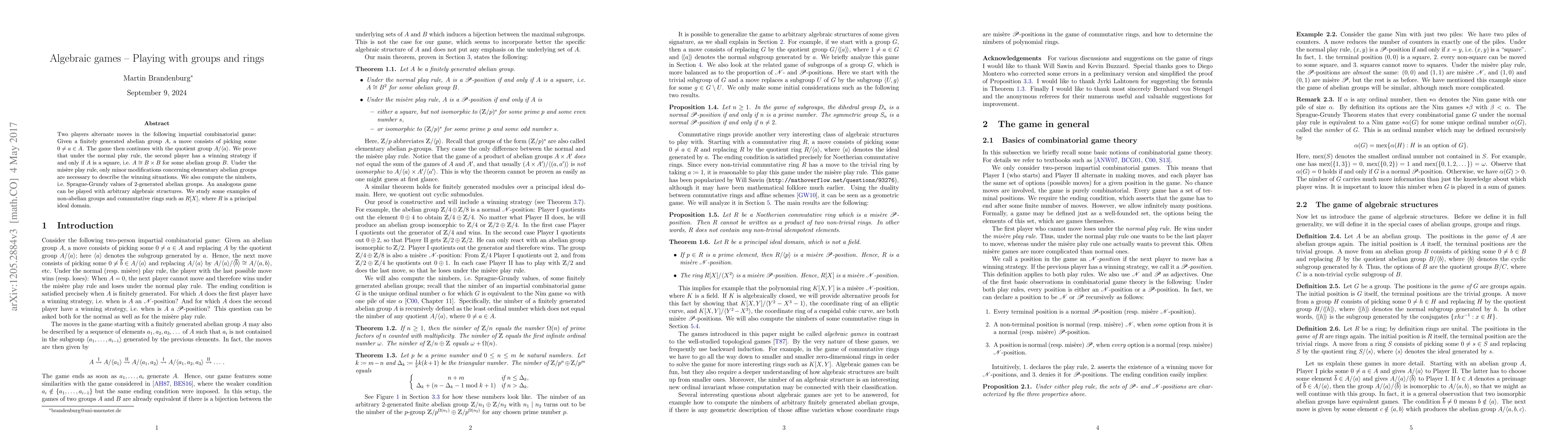 Two players alternate moves in the following impartial combinatorial game: Given a finitely generated abelian group $A$, a move consists of picking some nonzero element $a \in A$. The game then continues with the quotient group $A/ \langle a \rangle$. We prove that under the normal play rule, the second player has a winning strategy if and only if $A$ is a square, i.e. $A$ is isomorphic to $B \times B$ for some abelian group $B$. Under the mis\`ere play rule, only minor modifications concerning elementary abelian groups are necessary to describe the winning situations. We also compute the nimbers, i.e. Sprague-Grundy values, of $2$-generated abelian groups. An analogous game can be played with arbitrary algebraic structures. We study some examples of non-abelian groups and commutative rings such as $R[X]$, where $R$ is a principal ideal domain.