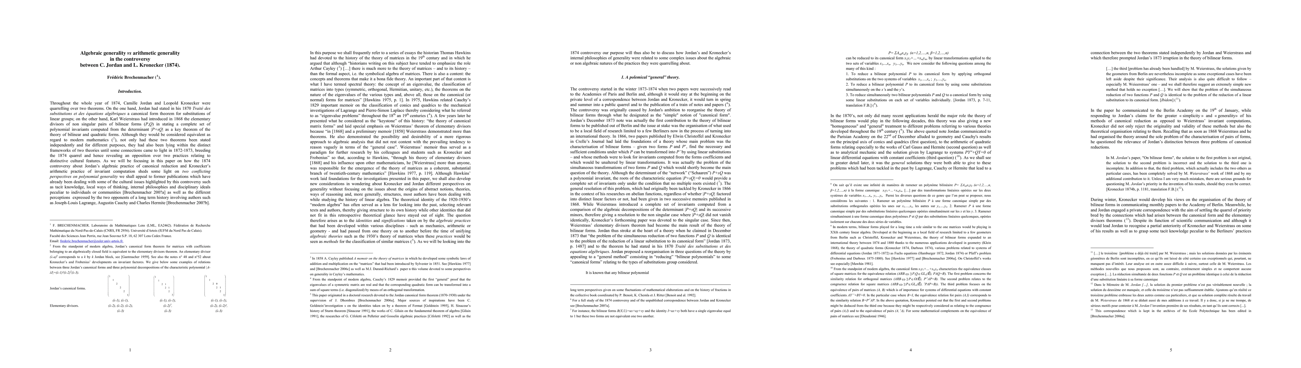 Throughout the whole year of 1874, C. Jordan and L. Kronecker were quarrelling over two theorems. On the one hand, Jordan had stated in 1870 a canonical form theorem for substitutions of linear groups; on the other hand, Karl Weierstrass had introduced in 1868 the elementary divisors of non singular pairs of bilinear forms (P,Q) in stating a key theorem of the theory of bilinear and quadratic forms. Although they would be considered equivalent as regard to modern mathematics, not only had these two theorems been stated independently and for different purposes, they had also been lying within the distinct frameworks of two theories until some connections came to light in 1872-1873, breeding the 1874 quarrel and hence revealing an opposition over two practices relating to distinctive cultural features. As we will be looking into the 1874 quarrel, our purpose will be to show how the complex identities of practices such as Jordan s canonical reduction and Kronecker s invariant computation highlight some cultural issues such as tacit knowledge and perceptions of history peculiar to individuals or communities as well as some local ways of thinking such as disciplinary ideals and internal philosophies of generality and simplicity.