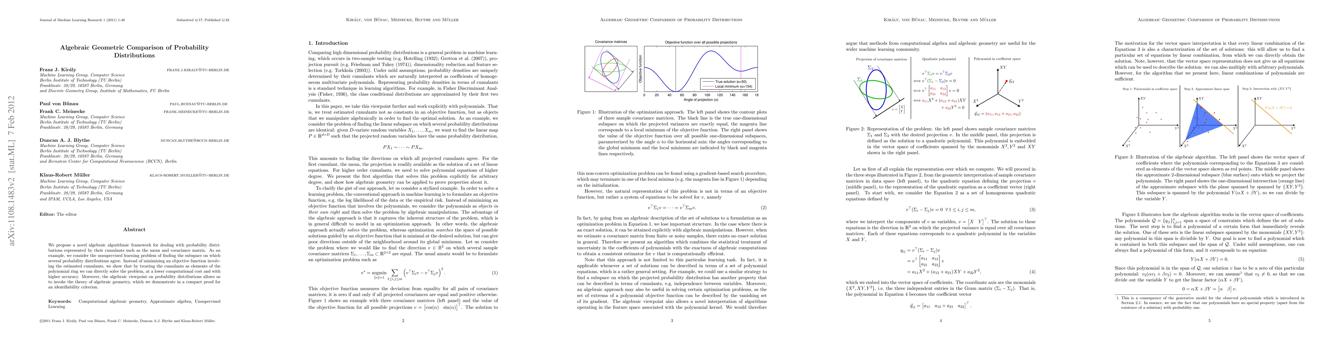 We propose a novel algebraic framework for treating probability distributions represented by their cumulants such as the mean and covariance matrix. As an example, we consider the unsupervised learning problem of finding the subspace on which several probability distributions agree. Instead of minimizing an objective function involving the estimated cumulants, we show that by treating the cumulants as elements of the polynomial ring we can directly solve the problem, at a lower computational cost and with higher accuracy. Moreover, the algebraic viewpoint on probability distributions allows us to invoke the theory of Algebraic Geometry, which we demonstrate in a compact proof for an identifiability criterion.