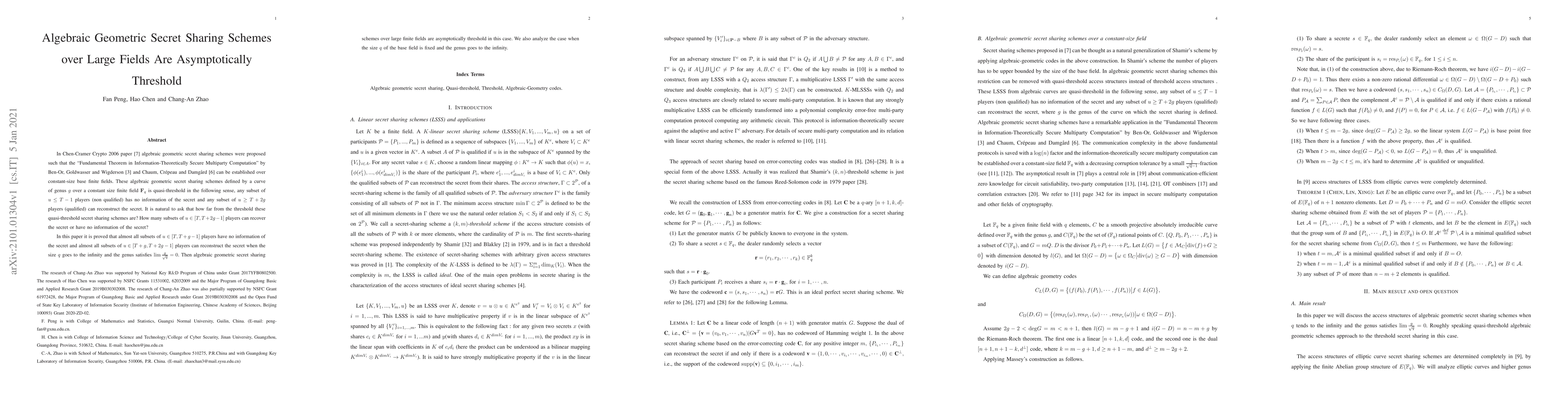 In Chen-Cramer Crypto 2006 paper \cite{cc} algebraic geometric secret sharing schemes were proposed such that the "Fundamental Theorem in Information-Theoretically Secure Multiparty Computation" by Ben-Or, Goldwasser and Wigderson \cite{BGW88} and Chaum, Cr\'{e}peau and Damg{\aa}rd \cite{CCD88} can be established over constant-size base finite fields. These algebraic geometric secret sharing schemes defined by a curve of genus $g$ over a constant size finite field ${\bf F}_q$ is quasi-threshold in the following sense, any subset of $u \leq T-1$ players (non qualified) has no information of the secret and any subset of $u \geq T+2g$ players (qualified) can reconstruct the secret. It is natural to ask that how far from the threshold these quasi-threshold secret sharing schemes are? How many subsets of $u \in [T, T+2g-1]$ players can recover the secret or have no information of the secret? In this paper it is proved that almost all subsets of $u \in [T,T+g-1]$ players have no information of the secret and almost all subsets of $u \in [T+g,T+2g-1]$ players can reconstruct the secret when the size $q$ goes to the infinity and the genus satisfies $\lim \frac{g}{\sqrt{q}}=0$. Then algebraic geometric secret sharing schemes over large finite fields are asymptotically threshold in this case. We also analyze the case when the size $q$ of the base field is fixed and the genus goes to the infinity.