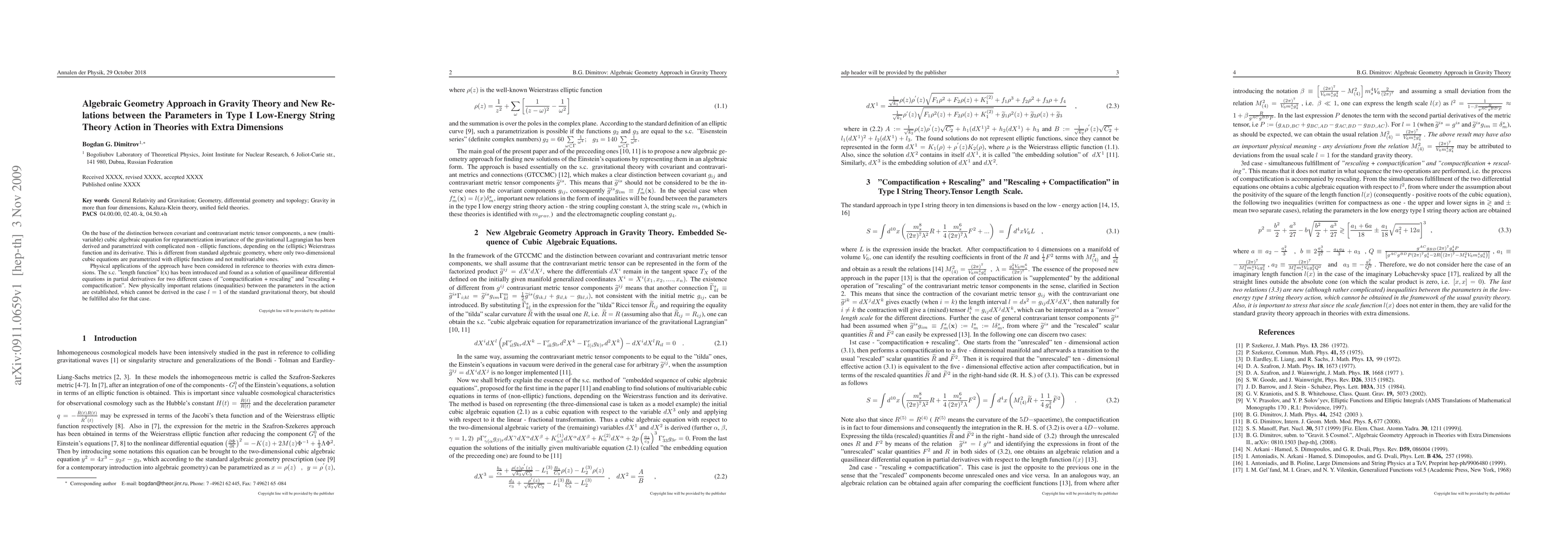On the base of the distinction between covariant and contravariant metric tensor components, a new (multivariable) cubic algebraic equation for reparametrization invariance of the gravitational Lagrangian has been derived and parametrized with complicated non - elliptic functions, depending on the (elliptic) Weierstrass function and its derivative. This is different from standard algebraic geometry, where only two-dimensional cubic equations are parametrized with elliptic functions and not multivariable ones. Physical applications of the approach have been considered in reference to theories with extra dimensions. The s.c. "length function" l(x) has been introduced and found as a solution of quasilinear differential equations in partial derivatives for two different cases of "compactification + rescaling" and "rescaling + compactification". New physically important relations (inequalities) between the parameters in the action are established, which cannot be derived in the case $l=1$ of the standard gravitational theory, but should be fulfilled also for that case.