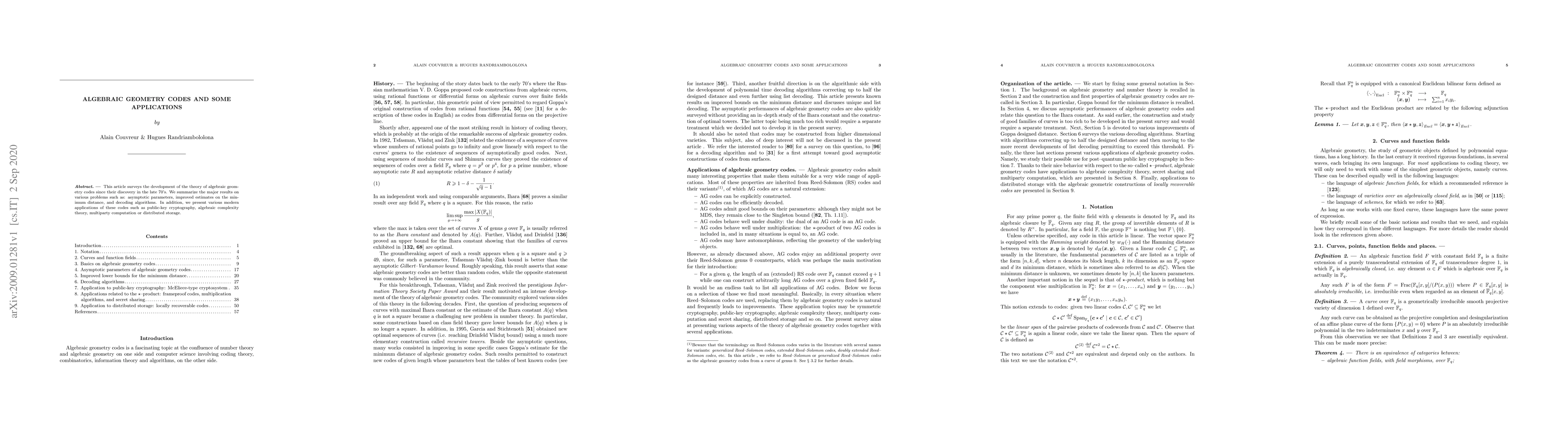 This article surveys the development of the theory of algebraic geometry codes since their discovery in the late 70's. We summarize the major results on various problems such as: asymptotic parameters, improved estimates on the minimum distance, and decoding algorithms. In addition, we present various modern applications of these codes such as public-key cryptography, algebraic complexity theory, multiparty computation or distributed storage.