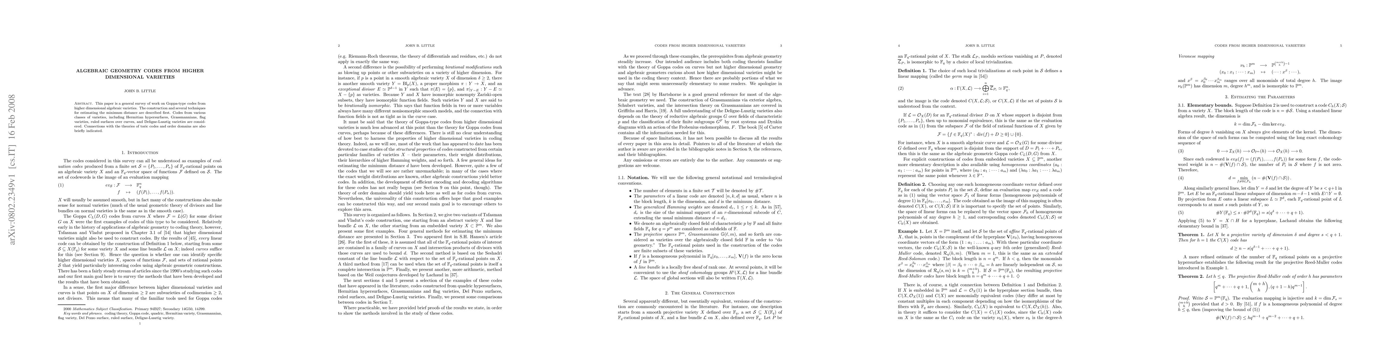 This paper surveys Goppa-type codes derived from higher dimensional algebraic varieties, detailing their construction and methods for estimating minimum distance, and discusses varieties like Hermitian hypersurfaces and Grassmannians, with connections to toric codes and order domains.