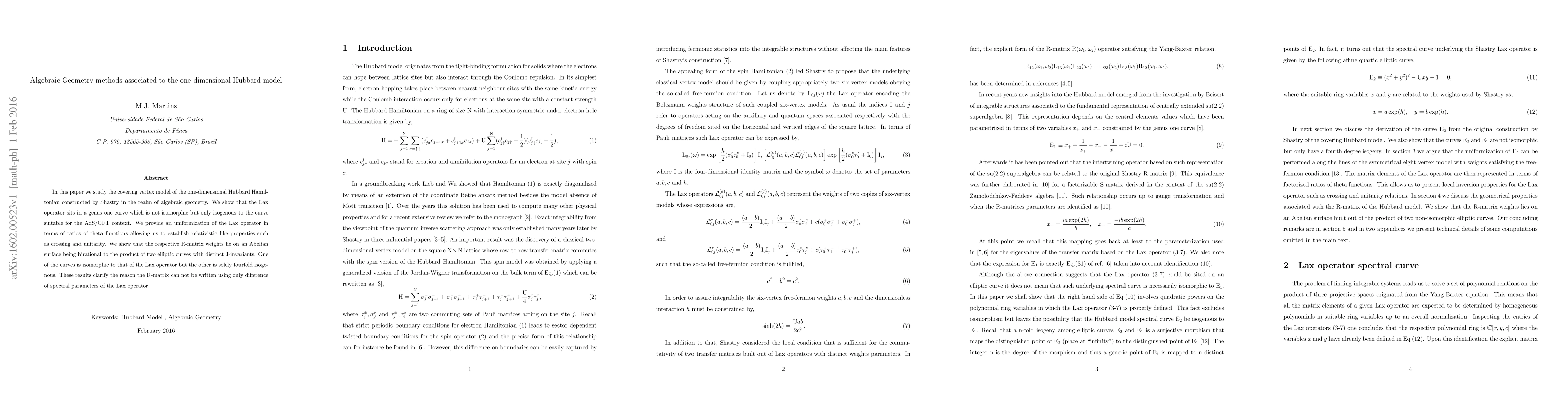 Researchers study the one-dimensional Hubbard model using algebraic geometry methods, finding that its Lax operator is related to a genus one curve with unique properties, clarifying why its R-matrix cannot be expressed in terms of spectral parameters.