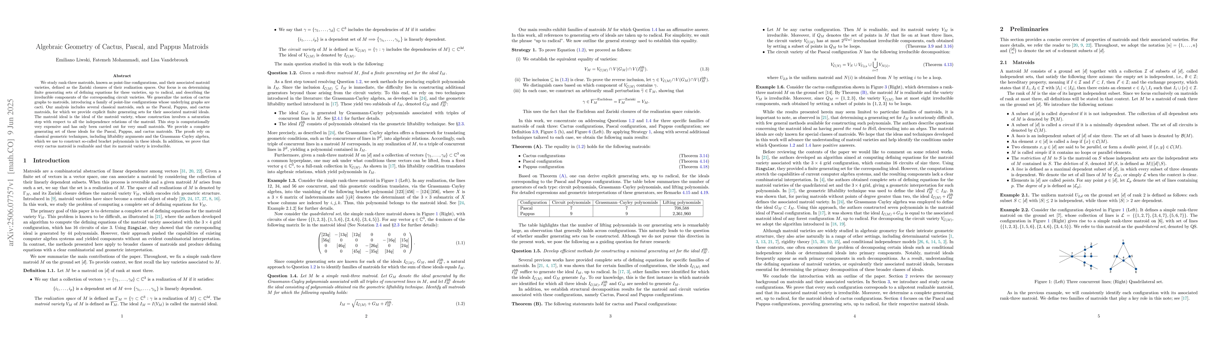 We study rank-three matroids, known as point-line configurations, and their associated matroid varieties, defined as the Zariski closures of their realization spaces. Our focus is on determining finite generating sets of defining equations for these varieties, up to radical, and describing the irreducible components of the corresponding circuit varieties. We generalize the notion of cactus graphs to matroids, introducing a family of point-line configurations whose underlying graphs are cacti. Our analysis includes several classical matroids, such as the Pascal, Pappus, and cactus matroids, for which we provide explicit finite generating sets for their associated matroid ideals. The matroid ideal is the ideal of the matroid variety, whose construction involves a saturation step with respect to all the independence relations of the matroid. This step is computationally very expensive and has only been carried out for very small matroids. We provide a complete generating set of these ideals for the Pascal, Pappus, and cactus matroids. The proofs rely on classical geometric techniques, including liftability arguments and the Grassmann--Cayley algebra, which we use to construct so-called bracket polynomials in these ideals. In addition, we prove that every cactus matroid is realizable and that its matroid variety is irreducible.