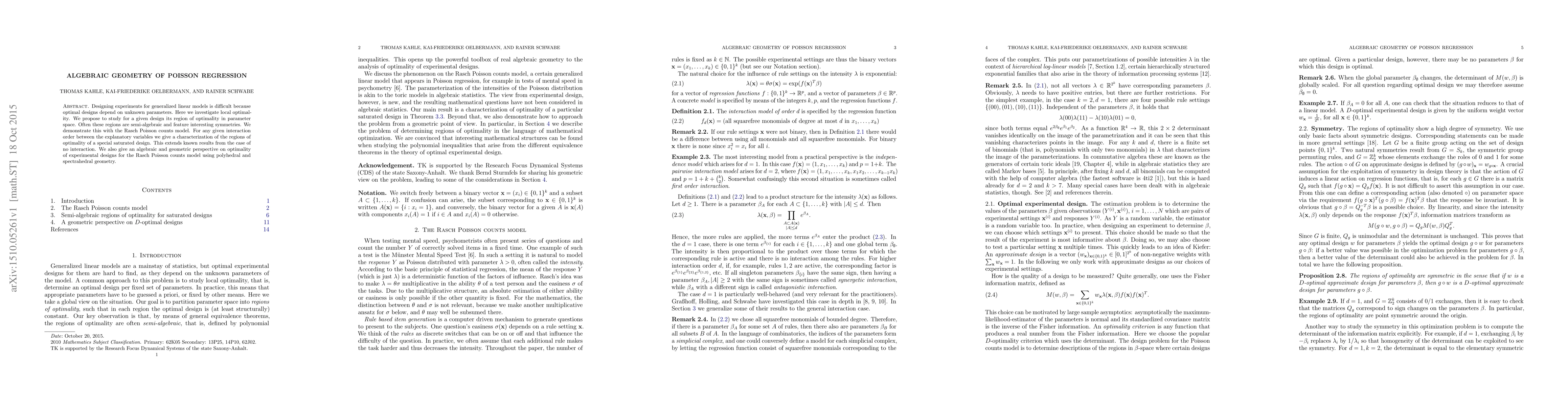 Designing experiments for generalized linear models is difficult because optimal designs depend on unknown parameters. Here we investigate local optimality. We propose to study for a given design its region of optimality in parameter space. Often these regions are semi-algebraic and feature interesting symmetries. We demonstrate this with the Rasch Poisson counts model. For any given interaction order between the explanatory variables we give a characterization of the regions of optimality of a special saturated design. This extends known results from the case of no interaction. We also give an algebraic and geometric perspective on optimality of experimental designs for the Rasch Poisson counts model using polyhedral and spectrahedral geometry.