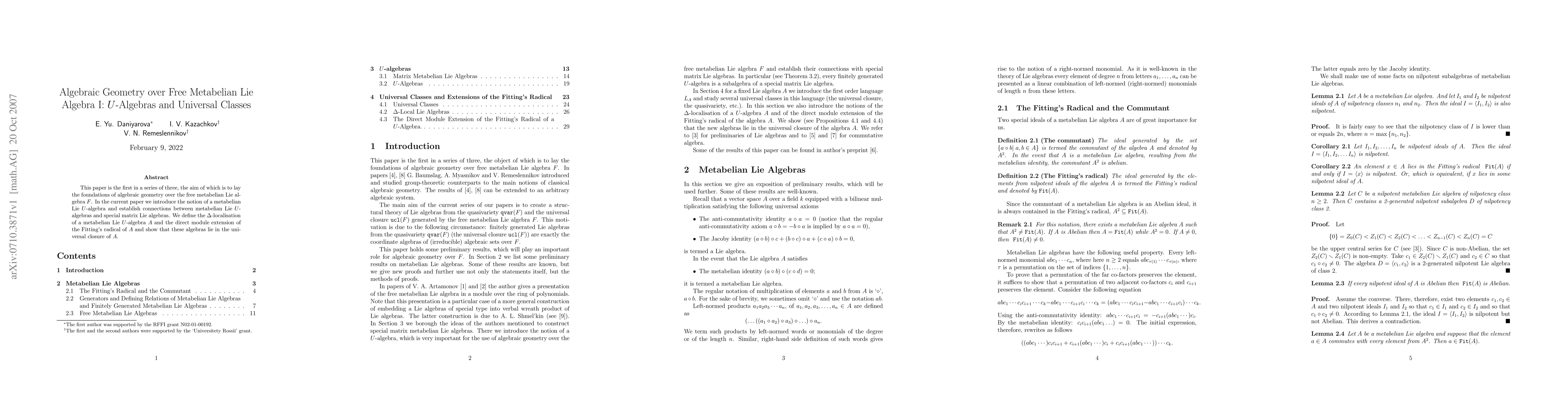 This paper establishes the groundwork for algebraic geometry over the free metabelian Lie algebra by introducing metabelian Lie $U$-algebras and linking them to special matrix Lie algebras. It also defines $\Delta$-localisation and direct module extensions, demonstrating their inclusion in the universal closure of the algebra.