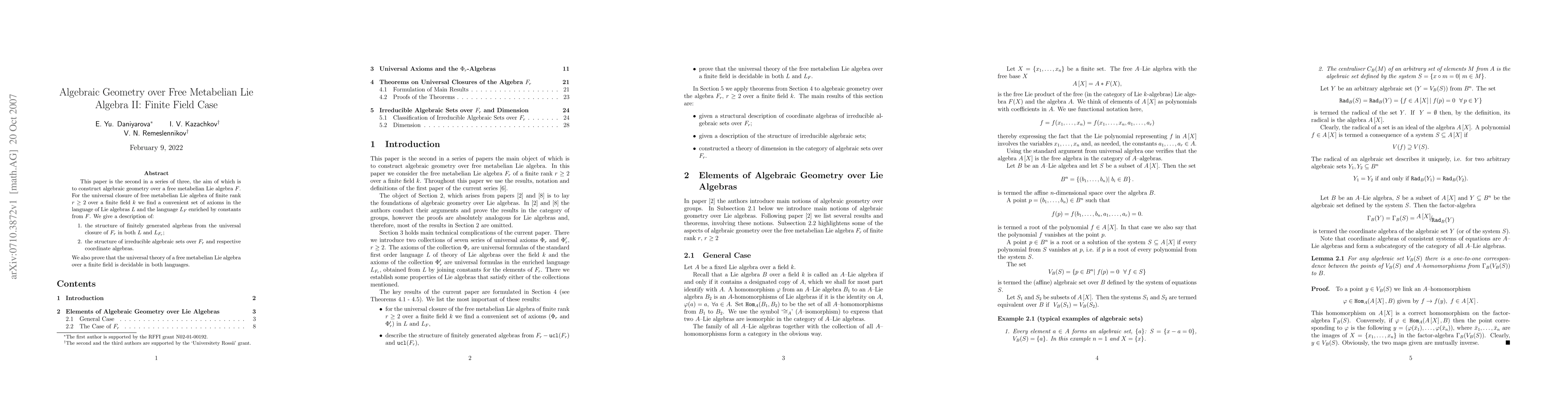 This paper constructs algebraic geometry over a free metabelian Lie algebra, presenting a set of axioms for the universal closure of such algebras over finite fields. It describes the structure of finitely generated algebras and irreducible algebraic sets, proving decidability of the universal theory in both relevant languages.