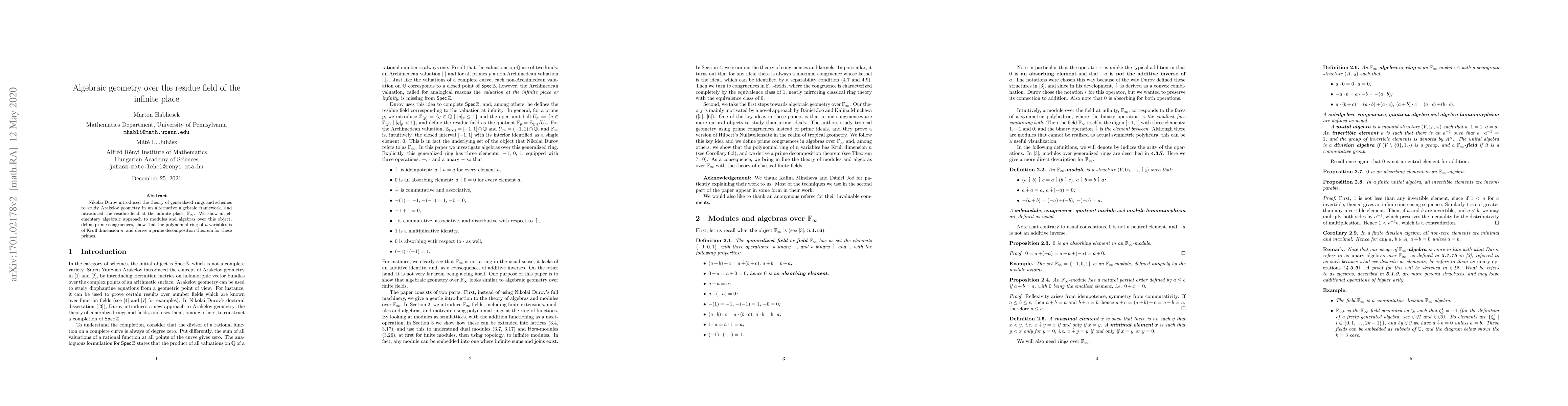 This paper explores an algebraic approach to modules and algebras over the residue field at the infinite place, introduced by Nikolai Durov in the context of Arakelov geometry. It establishes prime congruences, confirms the Krull dimension of the polynomial ring, and presents a prime decomposition theorem.