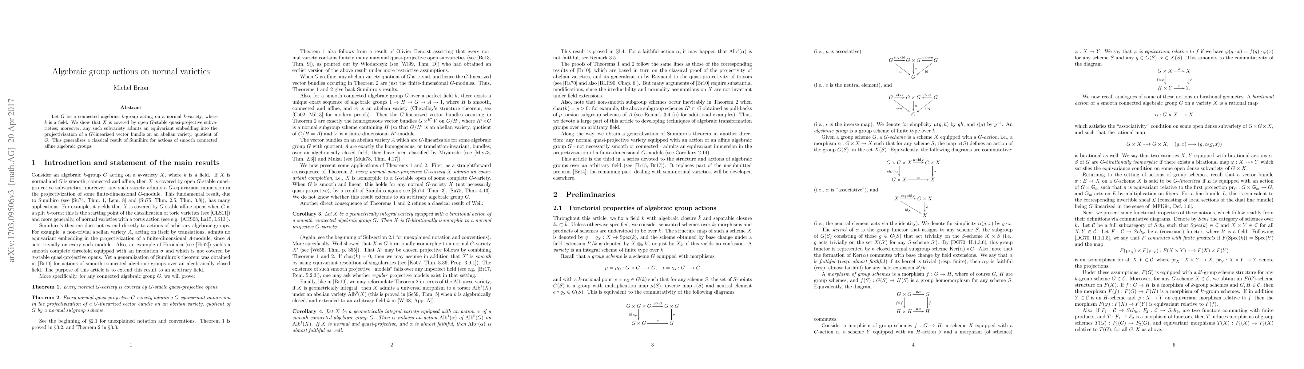 Let $G$ be a connected algebraic $k$-group acting on a normal $k$-variety, where $k$ is a field. We show that $X$ is covered by open $G$-stable quasi-projective subvarieties; moreover, any such subvariety admits an equivariant embedding into the projectivization of a $G$-linearized vector bundle on an abelian variety, quotient of $G$. This generalizes a classical result of Sumihiro for actions of smooth connected affine algebraic groups.