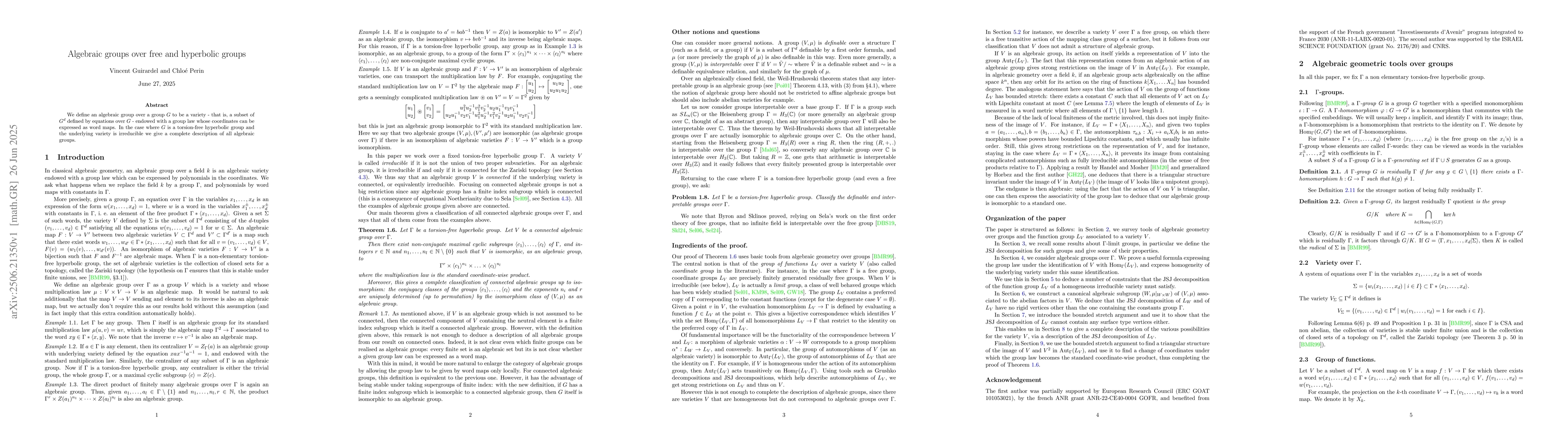 We define an algebraic group over a group $G$ to be a variety - that is, a subset of $G^d$ defined by equations over $G$ - endowed with a group law whose coordinates can be expressed as word maps. In the case where $G$ is a torsion-free hyperbolic group and the underlying variety is irreducible we give a complete description of all algebraic groups.