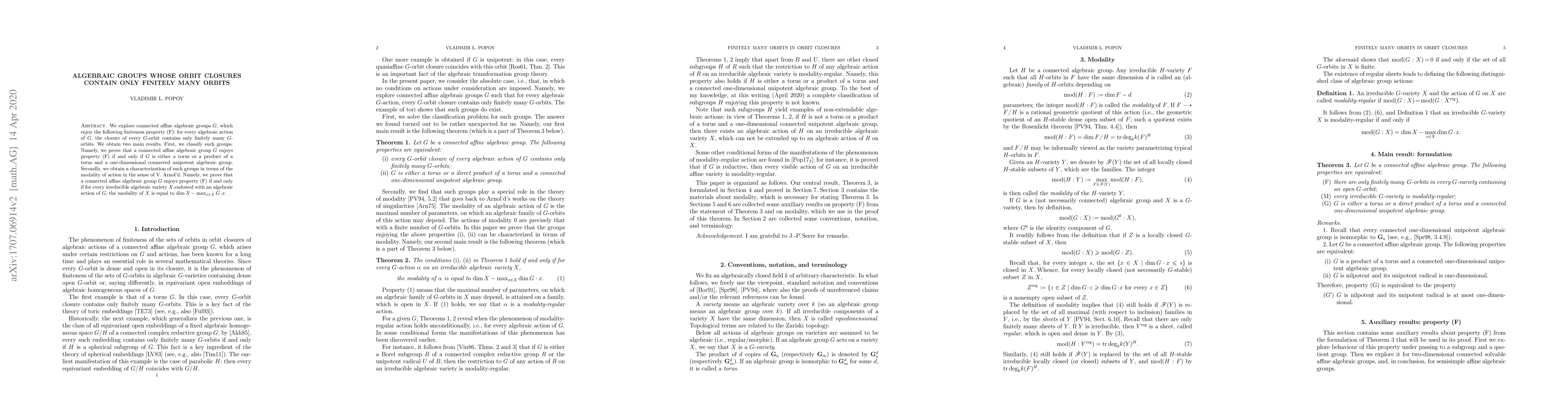 We explore connected affine algebraic groups $G$, which enjoy the following finiteness property $\rm (F)$: for every algebraic action of $G$, the closure of every $G$-orbit contains only finitely many $G$-orbits. We obtain two main results. First, we classify such groups. Namely, we prove that a connected affine algebraic group $G$ enjoys property $\rm (F)$ if and only if $G$ is either a torus or a product of a torus and a one-dimensional connected unipotent algebraic group. Secondly, we obtain a characterization of such groups in terms of the modality of action in the sense of V. Arnol'd. Namely, we prove that a connected affine algebraic group $G$ enjoys property $\rm (F)$ if and only if for every irreducible algebraic variety $X$ endowed with an algebraic action of $G$, the modality of $X$ is equal to $\dim X-\max_{x\in X} G\cdot x$.