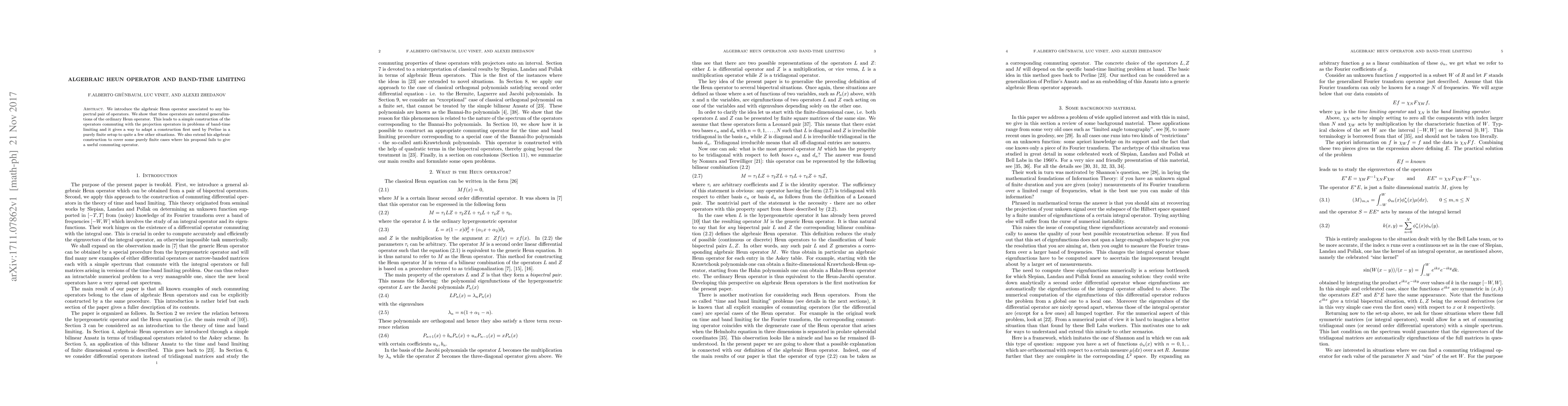 We introduce the algebraic Heun operator associated to any bispectral pair of operators. We show that these operators are natural generalizations of the ordinary Heun operator. This leads to a simple construction of the operators commuting with the projection operators in problems of band-time limiting and it gives a way to adapt a construction first used by Perline in a purely finite setup to quite a few other situations. We also extend his algebraic construction to cover some purely finite cases where his proposal fails to give a useful commuting operator.