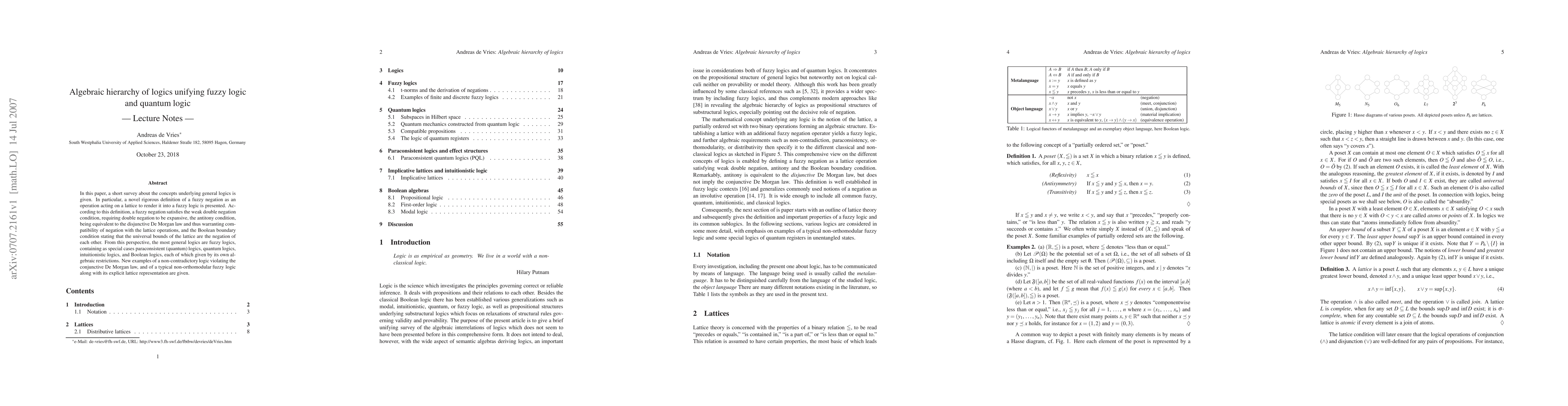 In this paper, a short survey about the concepts underlying general logics is given. In particular, a novel rigorous definition of a fuzzy negation as an operation acting on a lattice to render it into a fuzzy logic is presented. According to this definition, a fuzzy negation satisfies the weak double negation condition, requiring double negation to be expansive, the antitony condition, being equivalent to the disjunctive De Morgan law and thus warranting compatibility of negation with the lattice operations, and the Boolean boundary condition stating that the universal bounds of the lattice are the negation of each other. From this perspective, the most general logics are fuzzy logics, containing as special cases paraconsistent (quantum) logics, quantum logics, intuitionistic logics, and Boolean logics, each of which given by its own algebraic restrictions. New examples of a non-contradictory logic violating the conjunctive De Morgan law, and of a typical non-orthomodular fuzzy logic along with its explicit lattice representation are given.