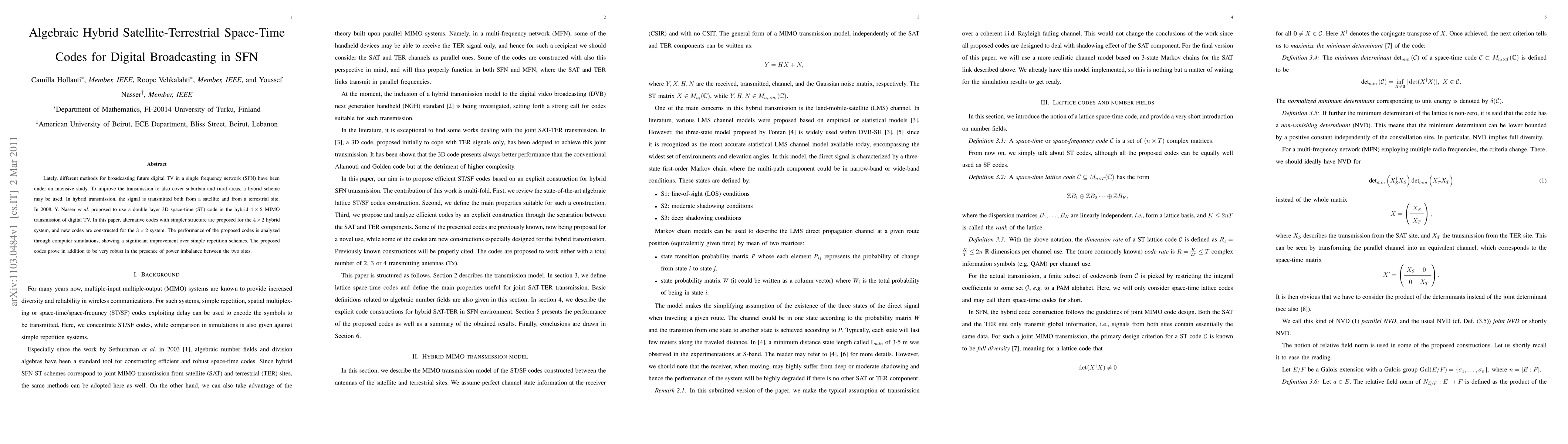 The paper proposes algebraic hybrid satellite-terrestrial space-time codes for digital broadcasting in a single frequency network (SFN). It investigates explicit construction schemes for 3 or 4 transmit antennas, comparing them with 2Tx Alamouti and 4Tx repetition codes.