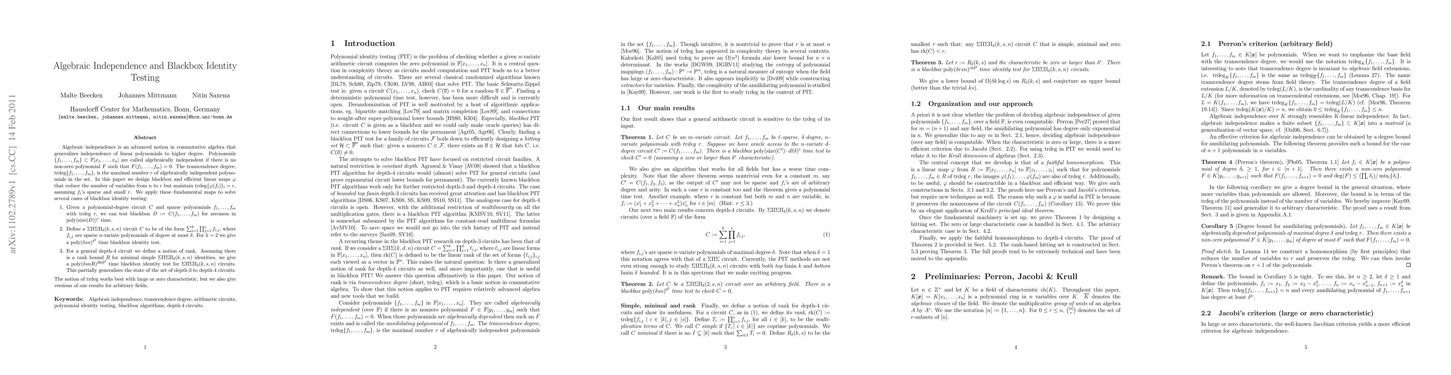 Researchers develop efficient algorithms for testing blackbox identity in algebraic independence, enabling fast verification of zero values in polynomial circuits with reduced variable counts.