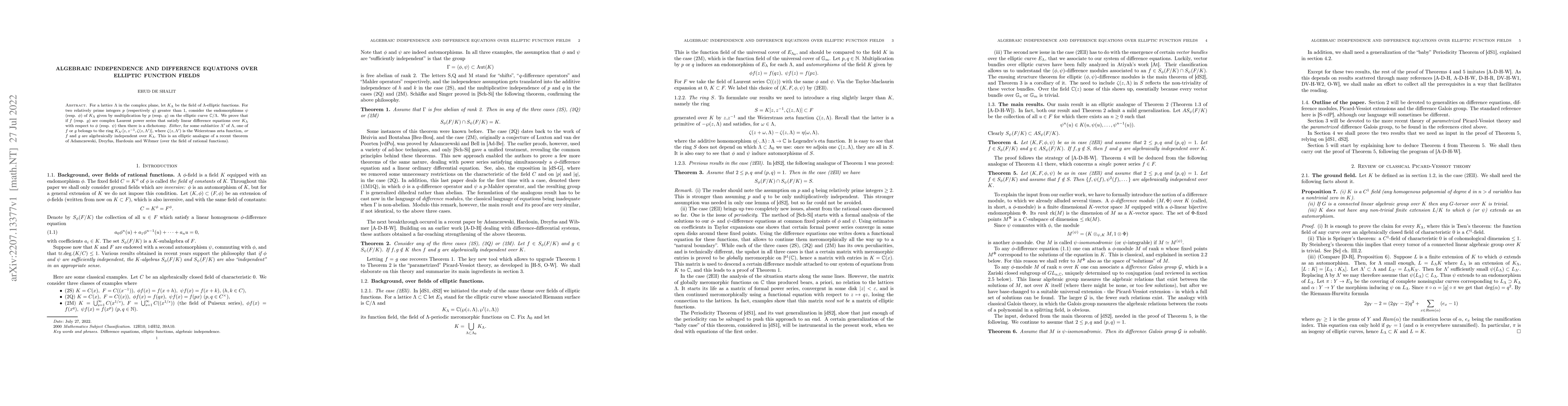 For a lattice \Lambda in the complex plane, let K_{\Lambda} be the field of \Lambda-elliptic functions. For two relatively prime integers p (respectively q) greater than 1, consider the endomorphisms \psi (resp. \phi) of K_{\Lambda} given by multiplication by p (resp. q) on the elliptic curve \mathbb{C}/\Lambda. We prove that if f (resp. g) are complex Laurent power series that satisfy linear difference equations over K_{\Lambda} with respect to \phi (resp. \psi) then there is a dichotomy. Either, for some sublattice \Lambda' of \Lambda, one of f or g belongs to the ring K_{\Lambda'}[z,z^{-1},\zeta(z,\Lambda')], where \zeta(z,\Lambda') is the Weierstrass zeta function, or f and g are algebraically independent over K_{\Lambda}. This is an elliptic analogue of a recent theorem of Adamczewski, Dreyfus, Hardouin and Wibmer (over the field of rational functions).