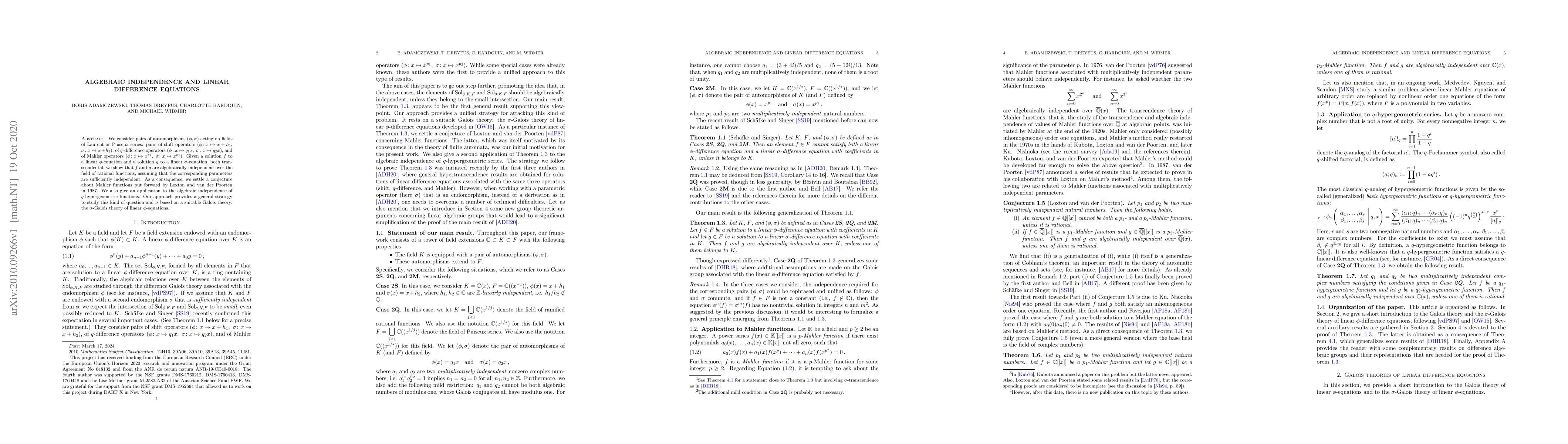 We consider pairs of automorphisms $(\phi,\sigma)$ acting on fields of Laurent or Puiseux series: pairs of shift operators $(\phi\colon x\mapsto x+h_1, \sigma\colon x\mapsto x+h_2)$, of $q$-difference operators $(\phi\colon x\mapsto q_1x,\ \sigma\colon x\mapsto q_2x)$, and of Mahler operators $(\phi\colon x\mapsto x^{p_1},\ \sigma\colon x\mapsto x^{p_2})$. Given a solution $f$ to a linear $\phi$-equation and a solution $g$ to a linear $\sigma$-equation, both transcendental, we show that $f$ and $g$ are algebraically independent over the field of rational functions, assuming that the corresponding parameters are sufficiently independent. As a consequence, we settle a conjecture about Mahler functions put forward by Loxton and van der Poorten in 1987. We also give an application to the algebraic independence of $q$-hypergeometric functions. Our approach provides a general strategy to study this kind of question and is based on a suitable Galois theory: the $\sigma$-Galois theory of linear $\phi$-equations.