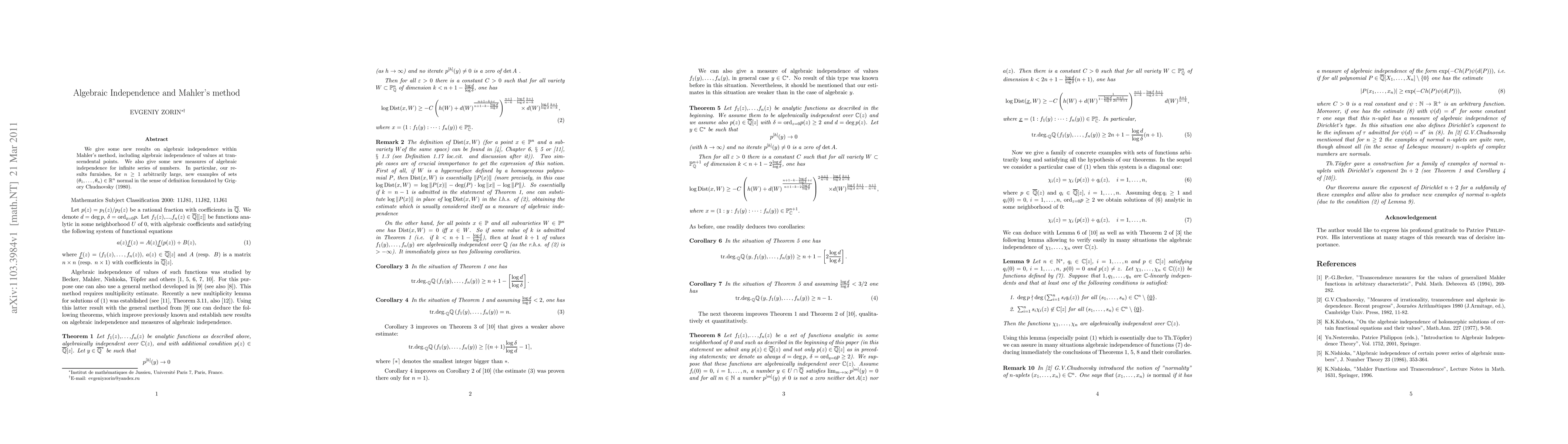 This paper presents new findings on algebraic independence using Mahler's method, including the independence of values at transcendental points and new measures for infinite series. It also provides large sets of normal numbers in $\mathbb{R}^n$ as defined by Grigory Chudnovsky.