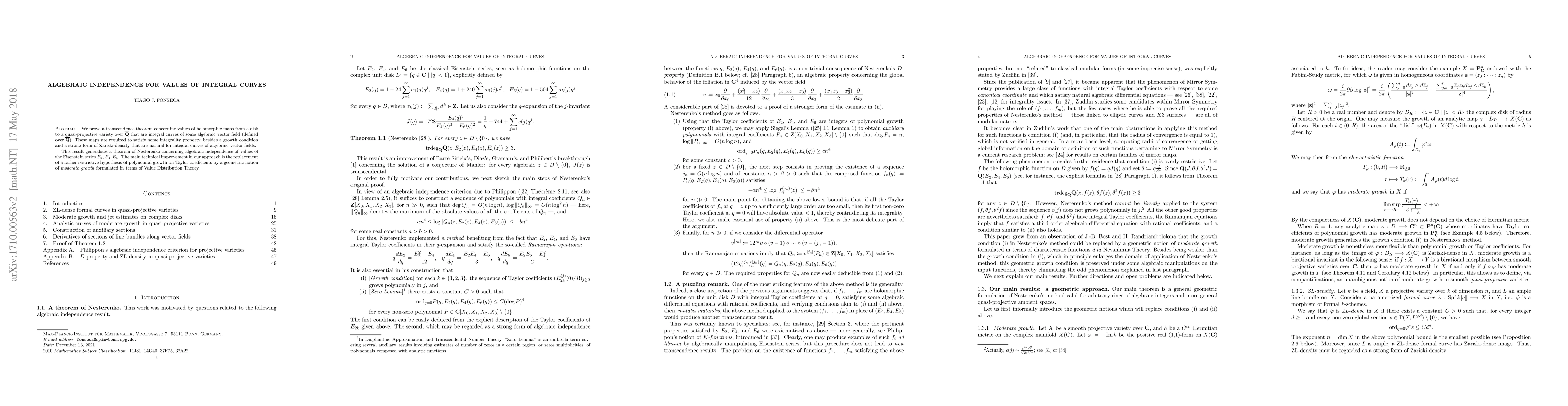 We prove a transcendence theorem concerning values of holomorphic maps from a disk to a quasi-projective variety over $\overline{\mathbf{Q}}$ that are integral curves of some algebraic vector field (defined over $\overline{\mathbf{Q}}$). These maps are required to satisfy some integrality property, besides a growth condition and a strong form of Zariski-density that are natural for integral curves of algebraic vector fields. This result generalizes a theorem of Nesterenko concerning algebraic independence of values of the Eisenstein series $E_2,E_4,E_6$. The main technical improvement in our approach is the replacement of a rather restrictive hypothesis of polynomial growth on Taylor coefficients by a geometric notion of moderate growth formulated in terms of Value Distribution Theory.